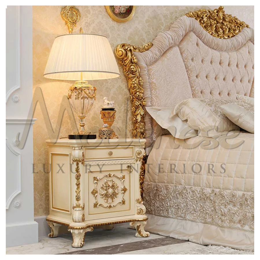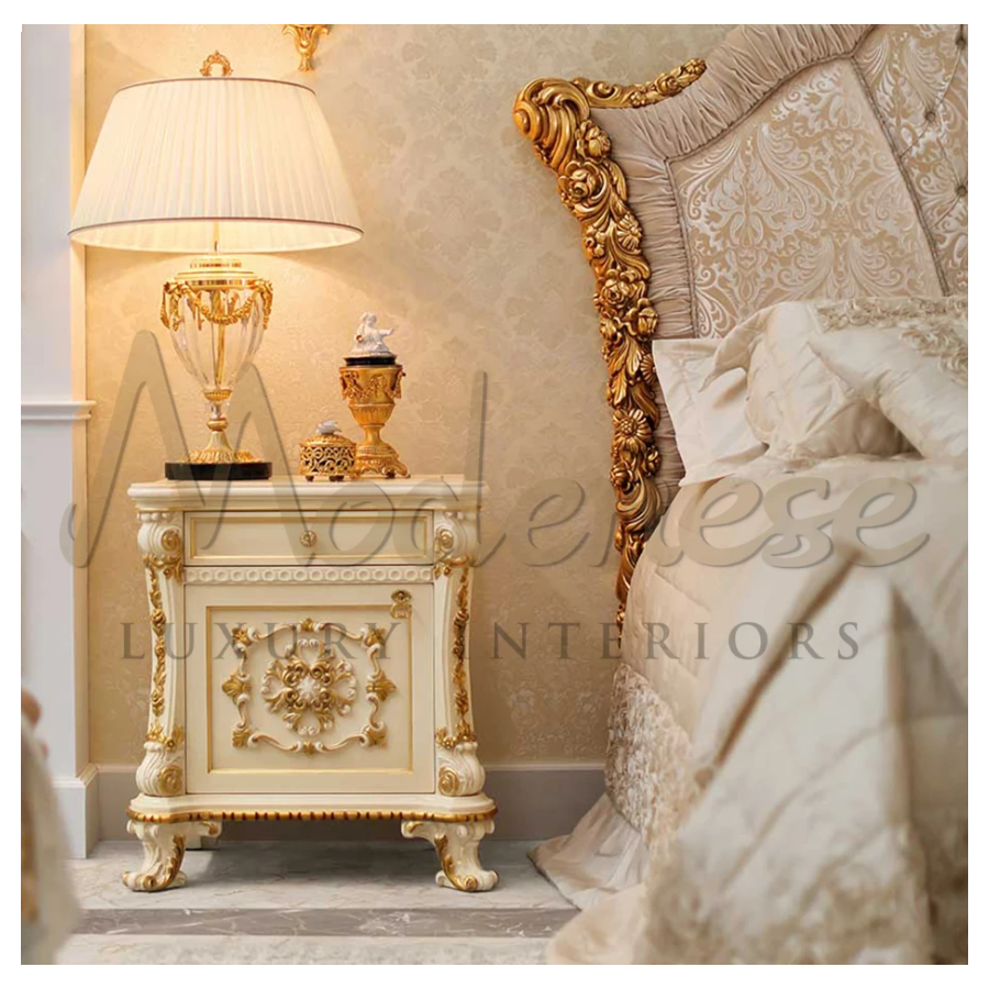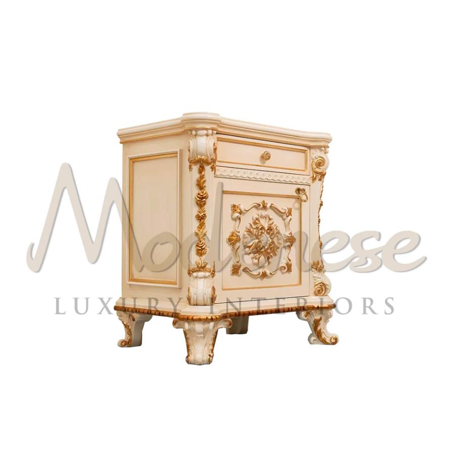 Modenese Furniture producer is proud to promote this brand new luxury night stand. This figured night stand features a lacquered ivory finish, baroque legs and carvings carefully hand-decorated with gold leaf. its elegant shape and the baroque touch make it a great candidate to fully furnish your bedroom with paired bed, wardrobe, vanity units and armchair from Modenese Furniture, that can take over your residential design project from A to Z.