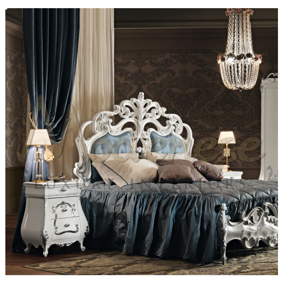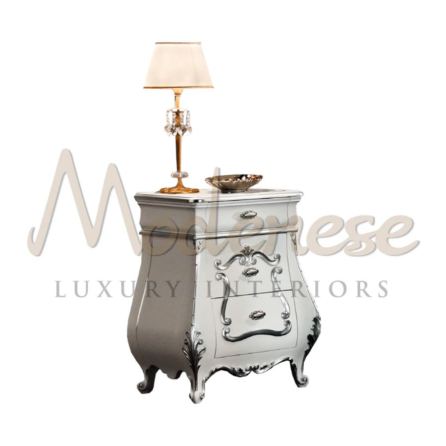 Elaborately carved baroque night stand by Modenese Furniture with white lacquered finish and silver leaf handmade decorations. This curved-shaped item, would be perfect in Your luxury bedroom alongside the bed and dressing table features 3 drawers.