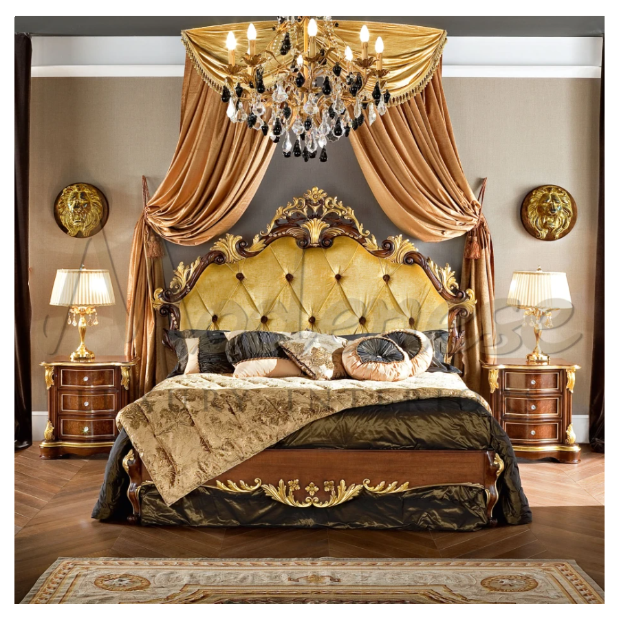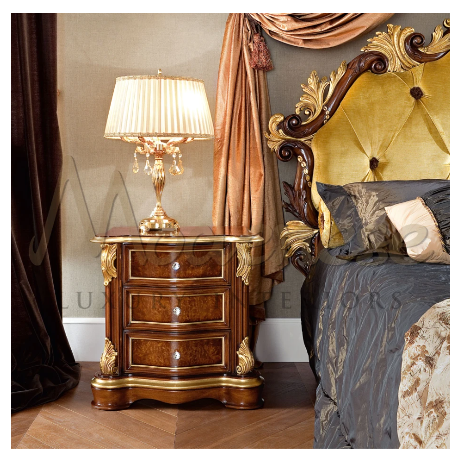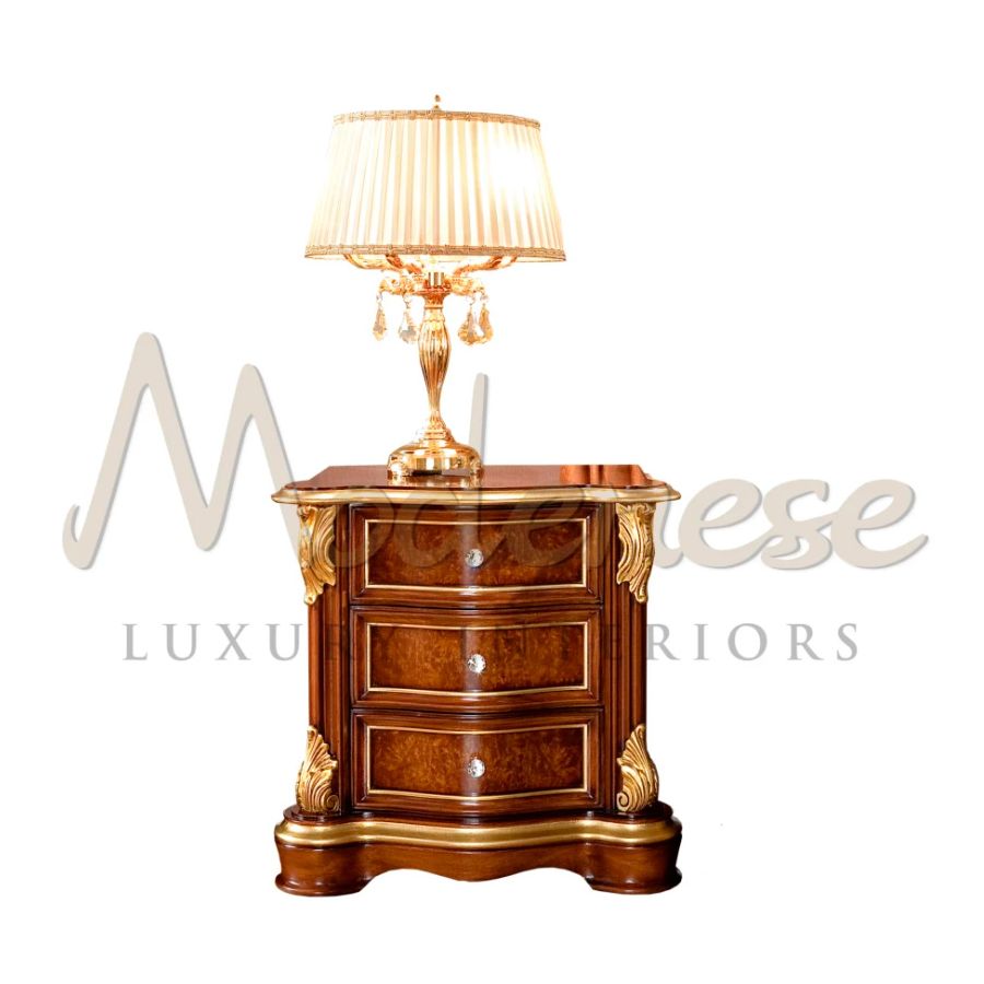 Enjoy your luxury baroque night with this one and only night stand. Set with blumotion soft-closing system, this elegant night stand features a radica wood version of classic walnut finish. The best you could ask for top quality furniture is here: shining crystal handles and patinated gold leaf details refinements. Modenese Furniture will provide your customizable design projects.