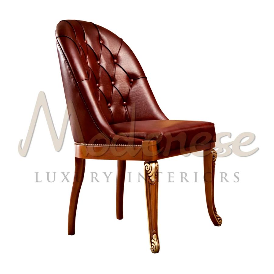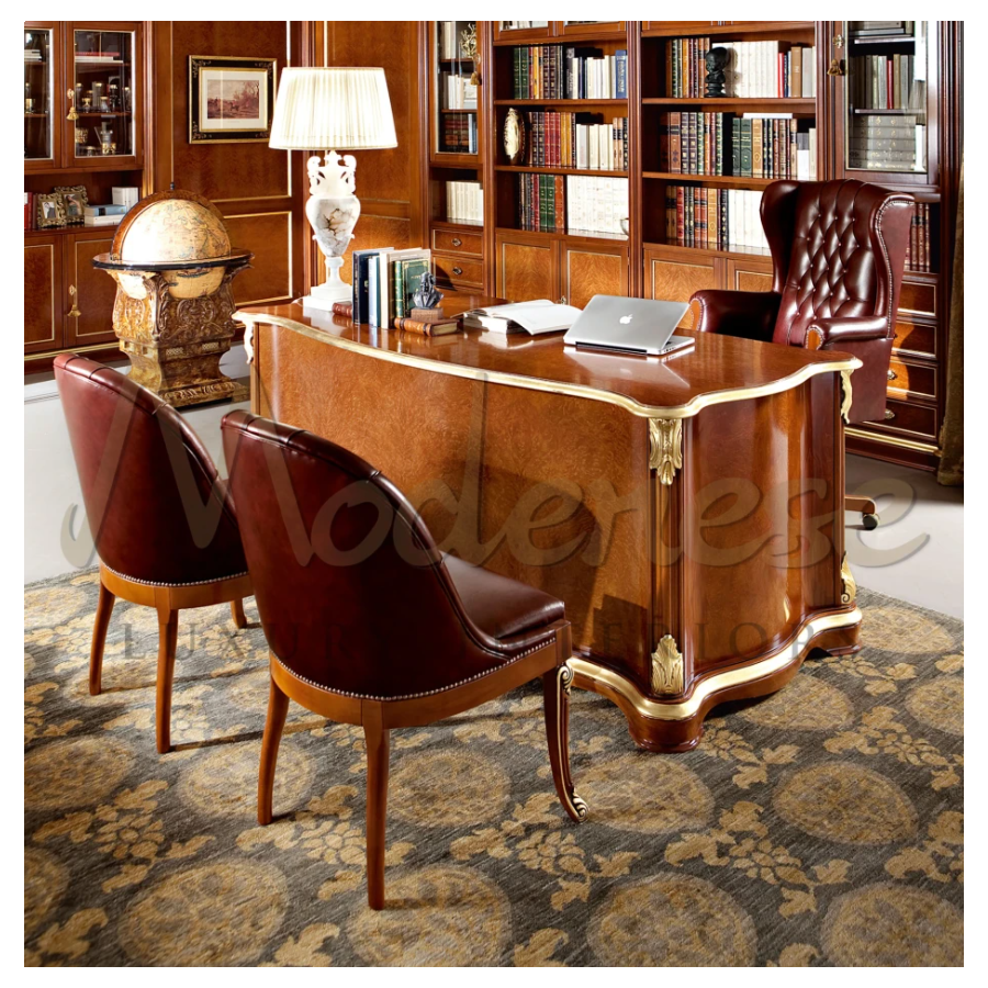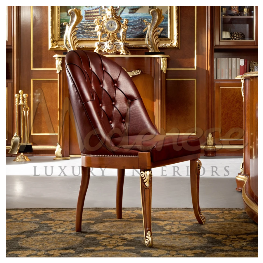 Guests office armchair in classic walnut finishing, handmade decorated with gold leaf. The little armchair, upholstered with burgundy leather, is produced with the best quality materials by Modenese Furniture.