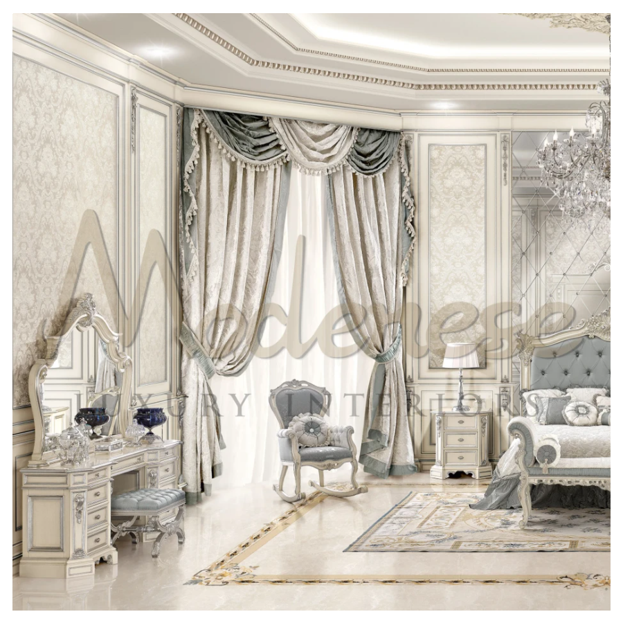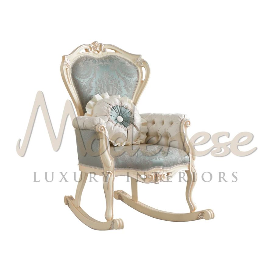 The ornamental quality and exclusive Italian design of this hand made baroque rocking chair is truly heavenly. The high-end soft ivory lacquered finishing, the baroque carvings completely decorated with silver leaf and the curved lines are paradise dreams. Upholstered in breathtaking celestial fabric by Modenese Furniture, the natural wood structure and the carved details contribute to the harmonious movement of the overall lavish design.