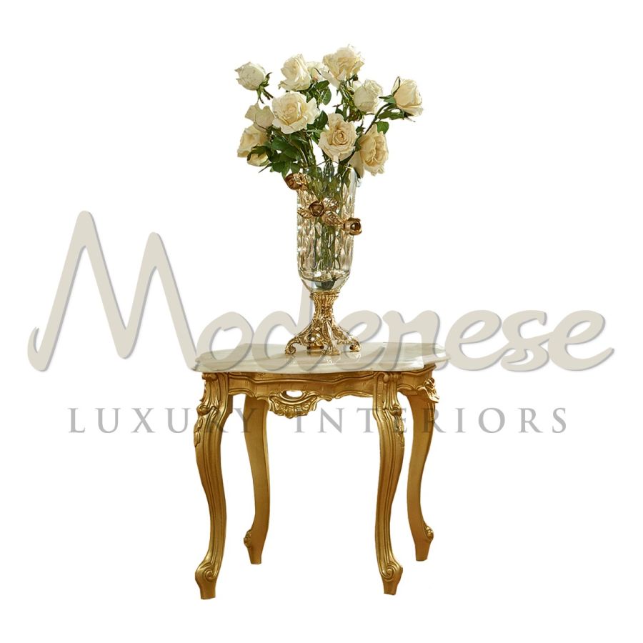 Slim and figured square side table with morbid edges and delicate carvings on the legs, decorated on the lower structure with pure gold-leaf . Goes well into luxury livings in private villas or summer penthouses. Modenese Luxury Interior design.