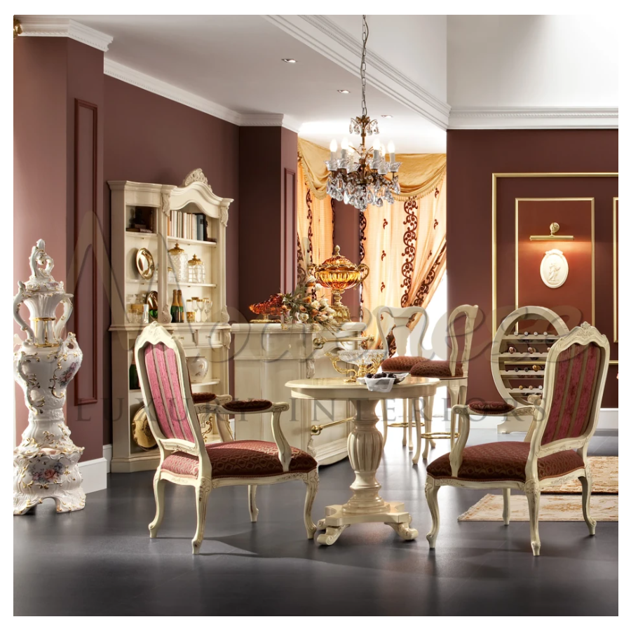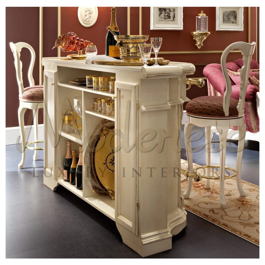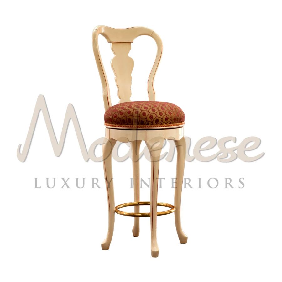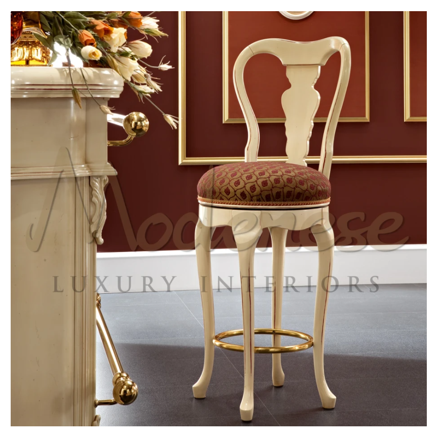 Elegant victorian bar stool in bright ivory finish, red upholstery and golden metal footrest. This seating element, which pairs with the Modenese Home Bar set, is thoughtfully hand-carved and ideal in lounge penthouses and secluded residences. Ask Modenese Interiors for a design consultancy.