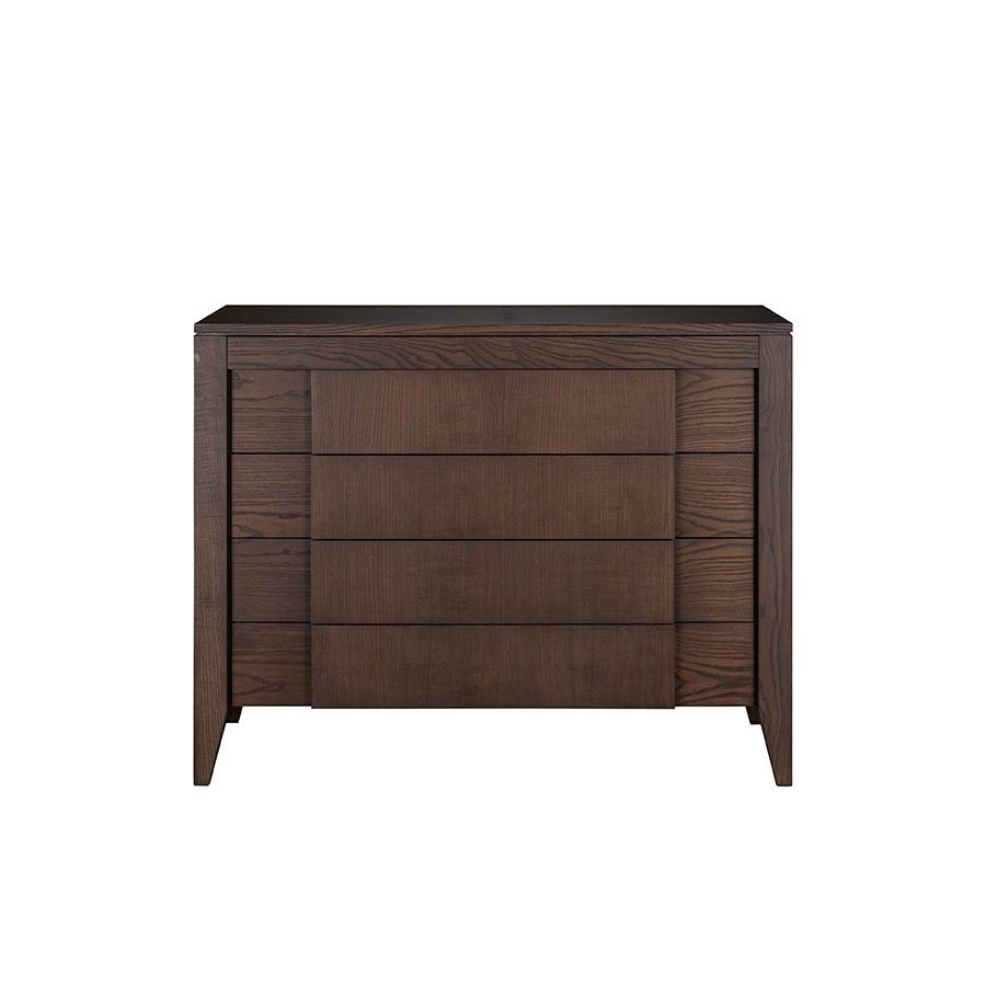 The natural wood grain decorates the Anerio chest of drawers and bedside table; the contrast in the wood grain is exalted by the peculiar shape of the front panels of the drawers.