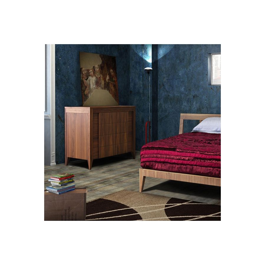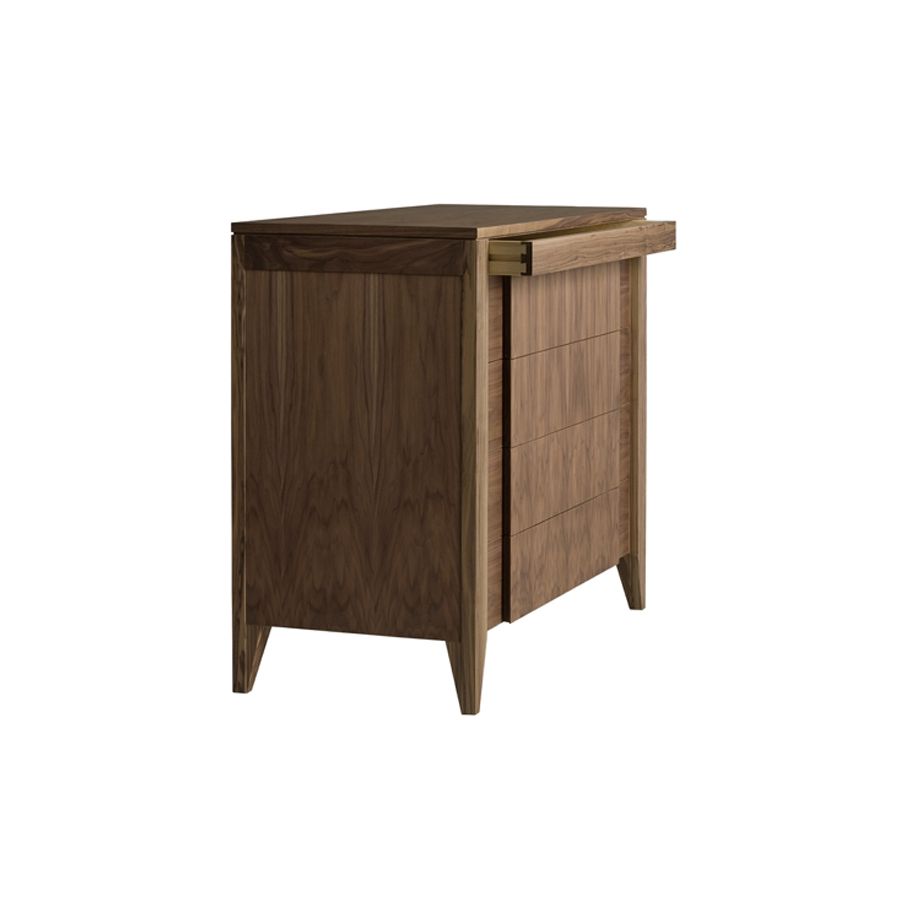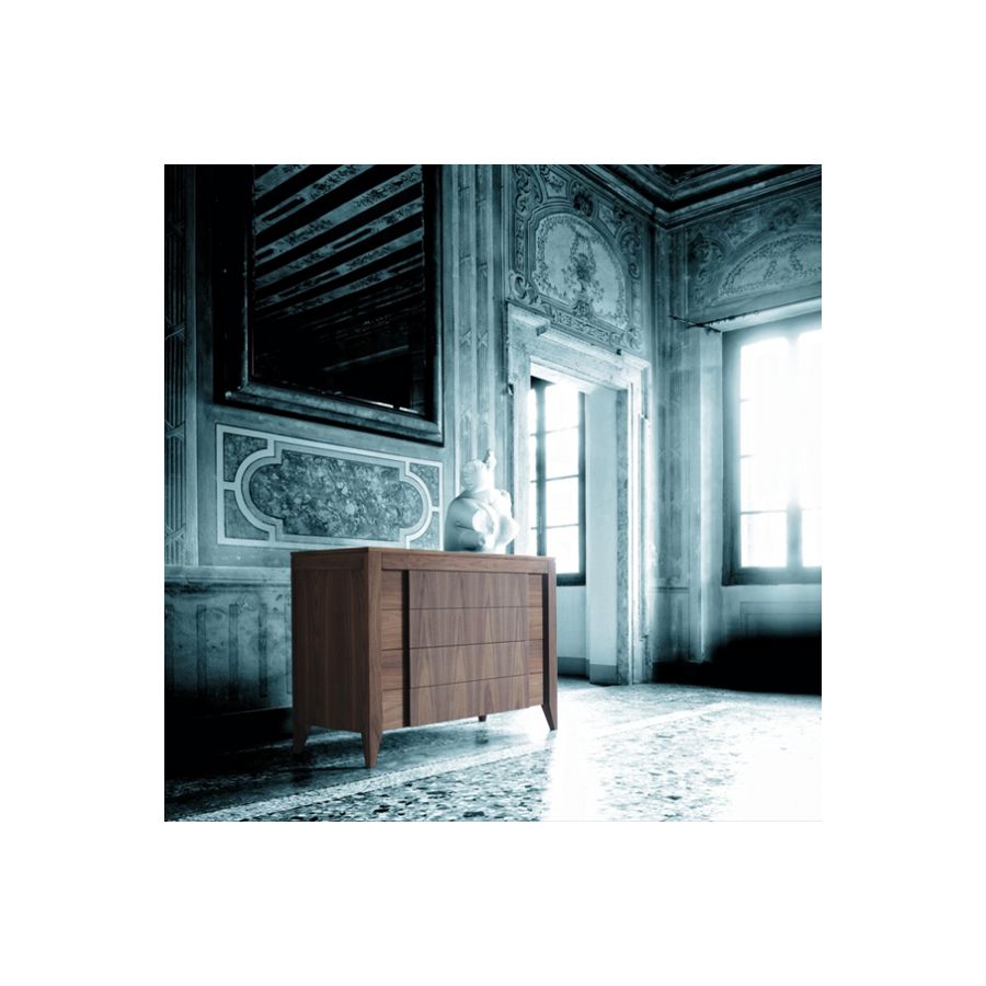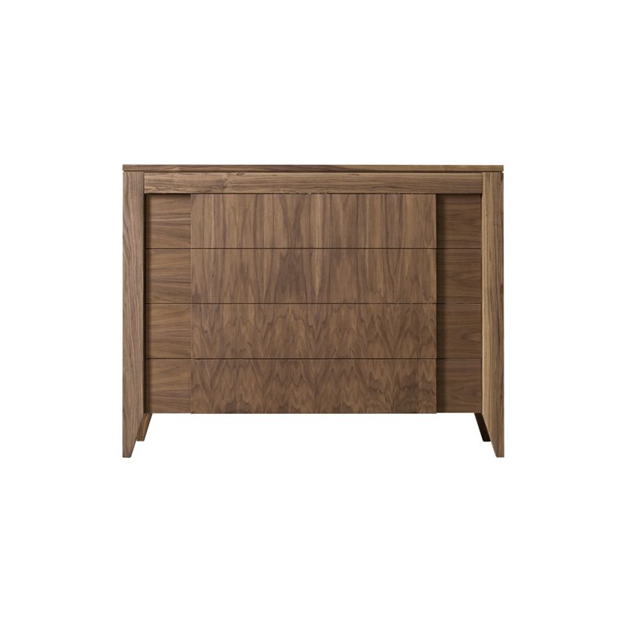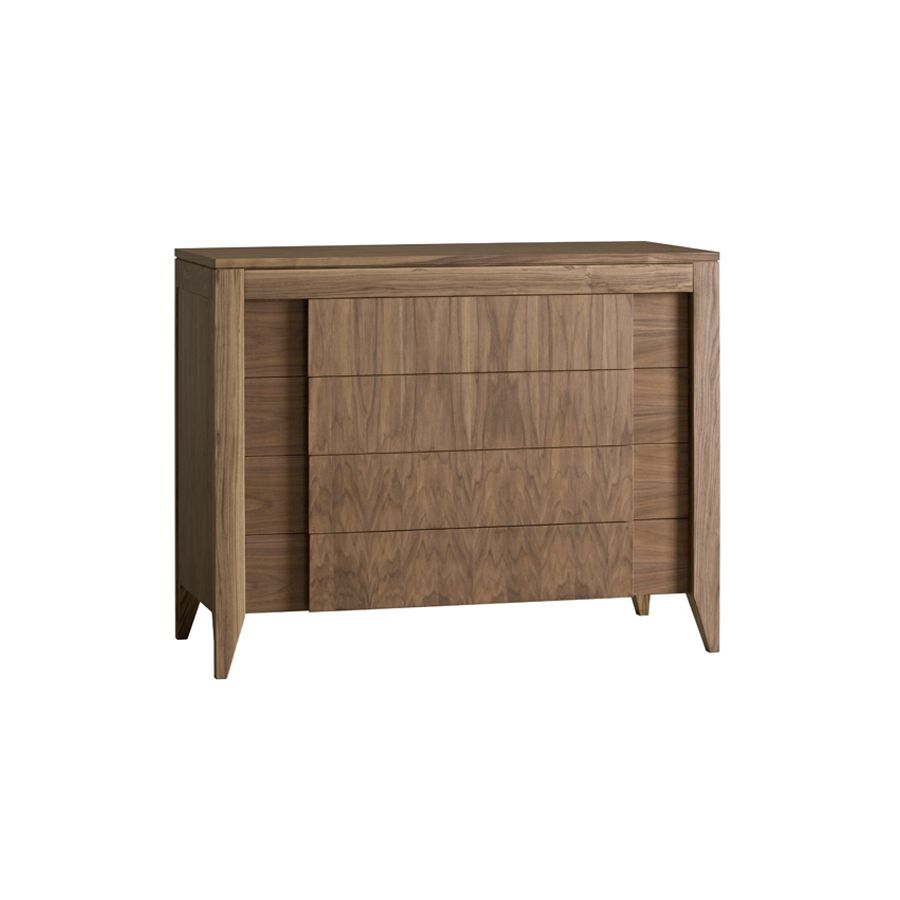 Chest of drawers made of canaletto walnut wood with 4 drawers and 1 hidden drawer under the top. Drawer fronts with opposed grain and different reliefs. The natural wood grain decorates the Anerio chest of drawers and bedside table; the contrast in the wood grain is exalted by the peculiar shape of the front panels of the drawers.