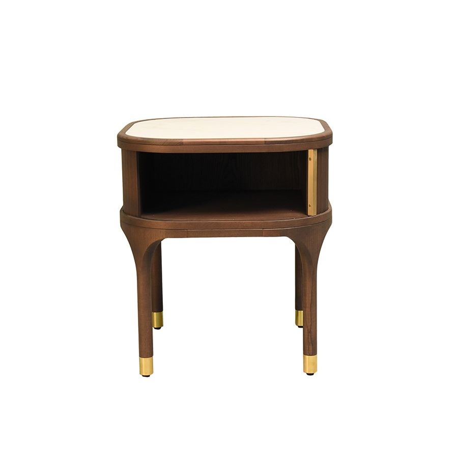 Ash wood bedside table, a compartment closed by a sliding door, brass handle. Shaped feet with brass cup. Top in wood or stone.