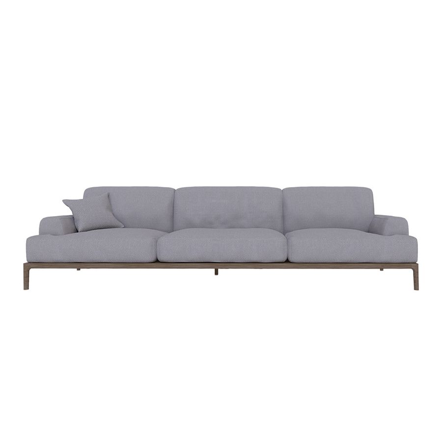 Sofa with structure in ash wood, back and seat cushions upholstered and covered in fabric or leather.