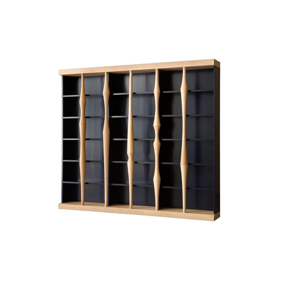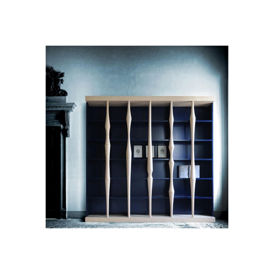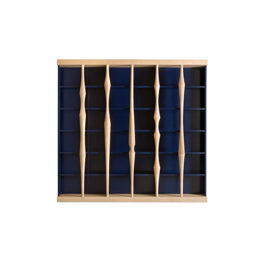 Open storage cabinet with cherry wood frame, blue lacquered. Base, top and front columns in maple wood.. MEASURES: L 300 W 40 H 270 WEIGHT: 250 kg M3: 2 PIECES: 17 Production time: 60 days. Shipping included in the price.