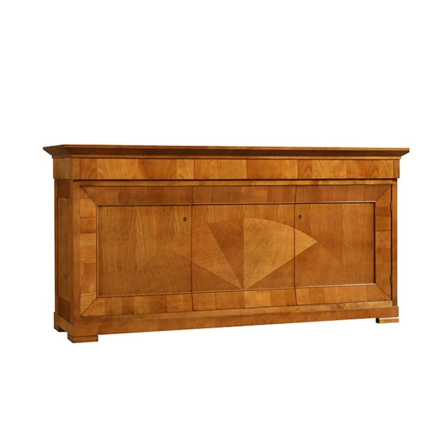 Sideboard made of cherry wood with precious arch veneer on the front. 3 doors, with adjustable internal shelves and 3 drawers.