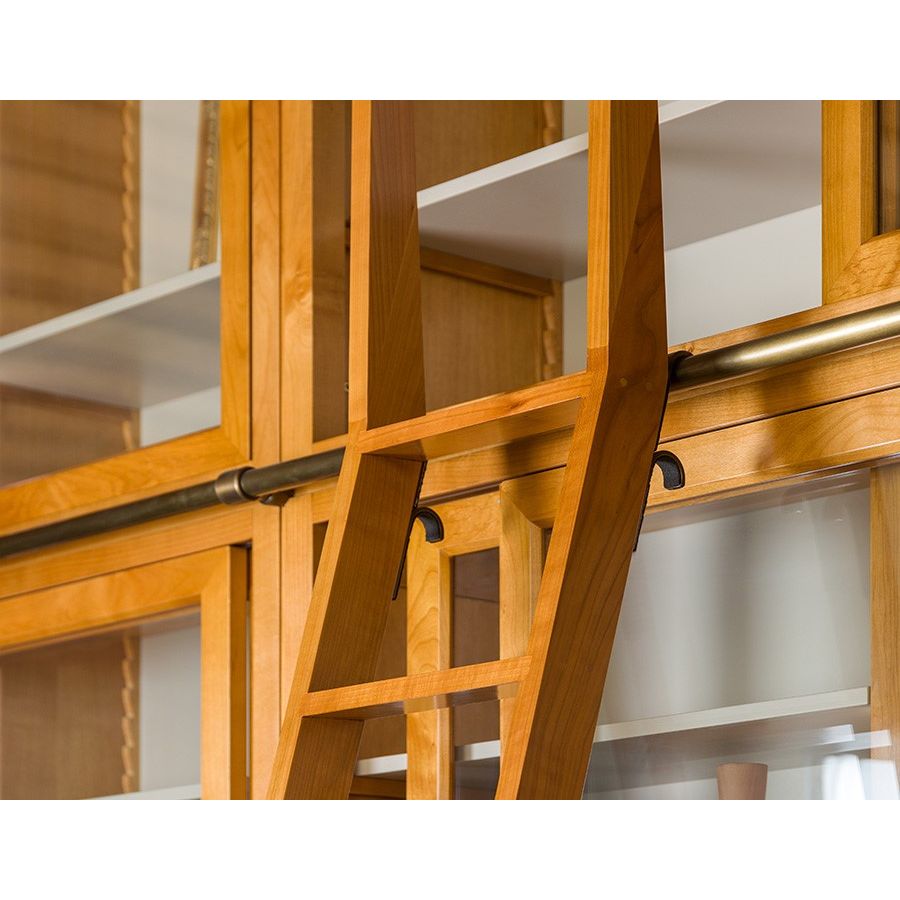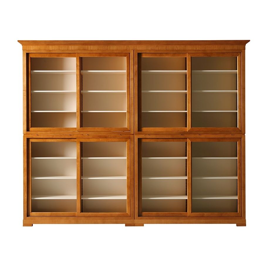 Proposal for Biedermeier modular bookcase in cherry wood. 4 modular elements with tempered glass sliding doors and adjustable shelves on wooden support. Hidden extensions between the overlapped elements. Glass or wooden sides.