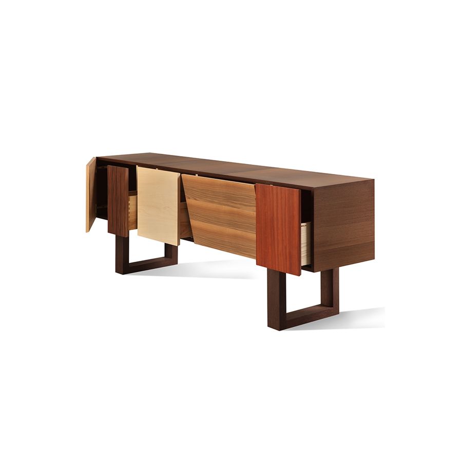In the Patchwork Collection, small pieces of wood are used in the same way in which offcuts and scraps of wool and fabrics are used to make fabric and blankets. In cabinet making Patchwork stands for the use of small pieces of different wood kinds, which exalt each other in elegant combinations. Duranti has used this technique to create drawers, doors, cabinet doors, flaps and unpredictable openings, which Morelato turned into unique pieces of sideboards, tables, coffee tables and bookcases that will be highlights in different home styles and cultures.