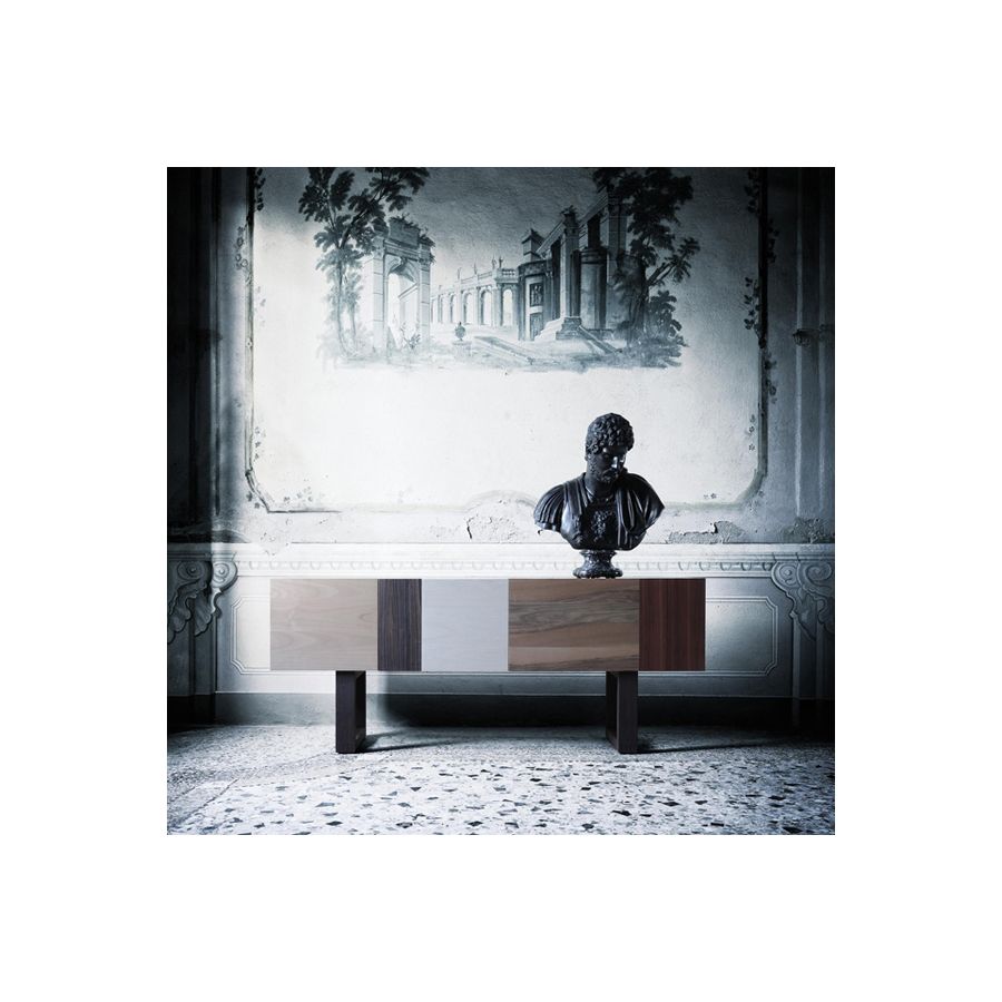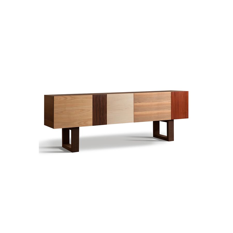 Sideboard with frame made of wengè wood. Drawers and doors veneered with different wood types: Makassar ebony, walnut, maple, cherry and padouk. Legs made of solid wengè. The Patchwork collection designed by Maurizio Duranti for Morelato is intended as a collection able to express the concept of modern furniture but at the same time remaining in the field of skillful cabinet making.