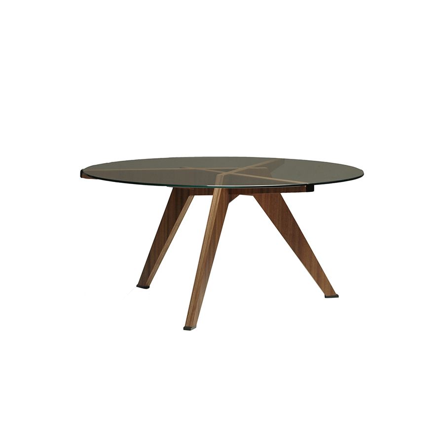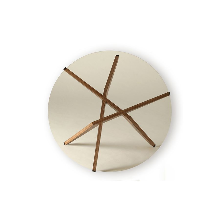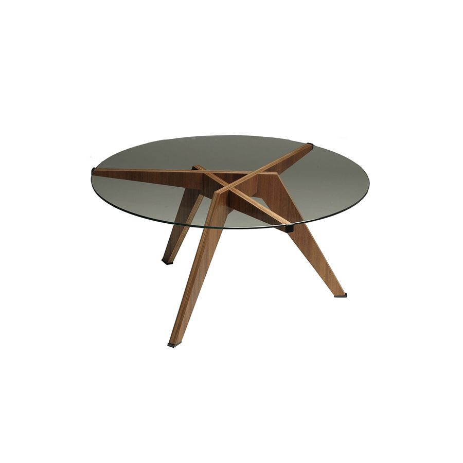 Boomerang is an elegant round coffee table, with three legs. Peculiar tail joints are used to assemble the legs. They are visible under its glass top.