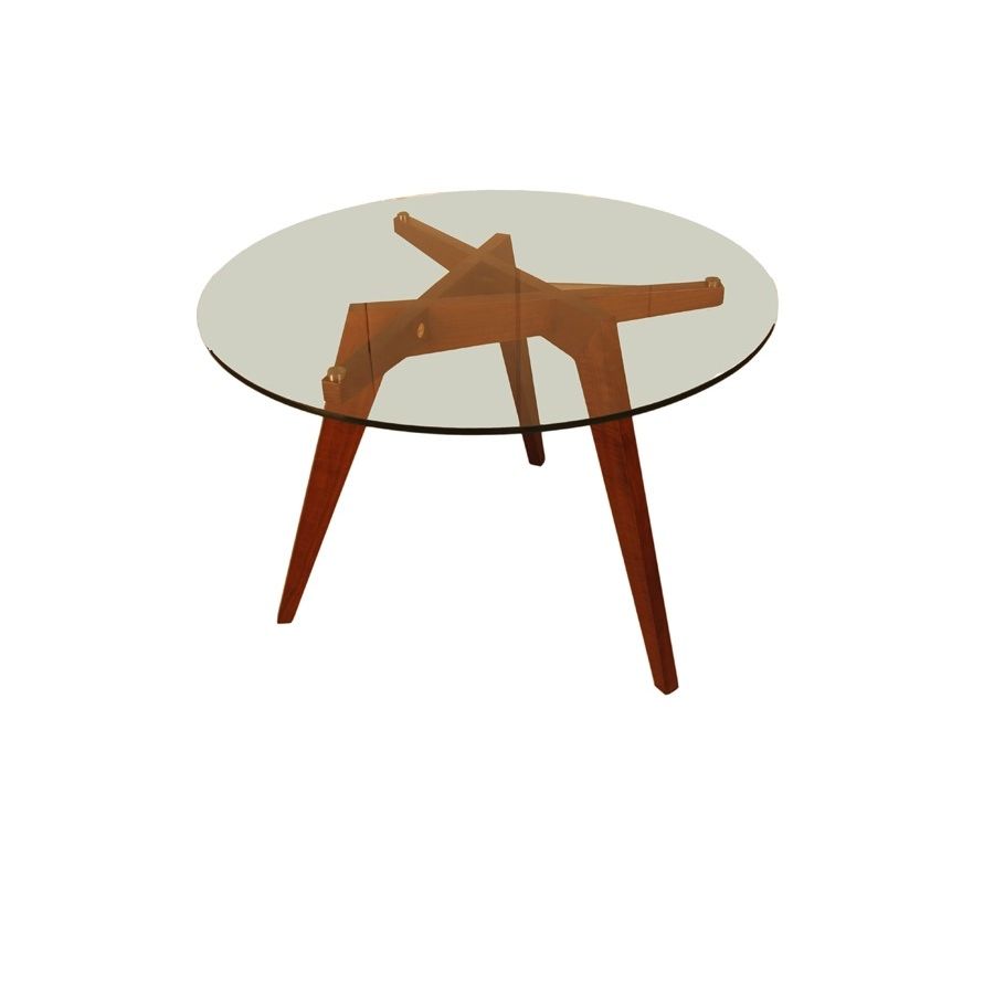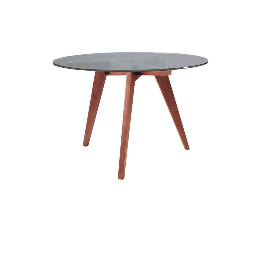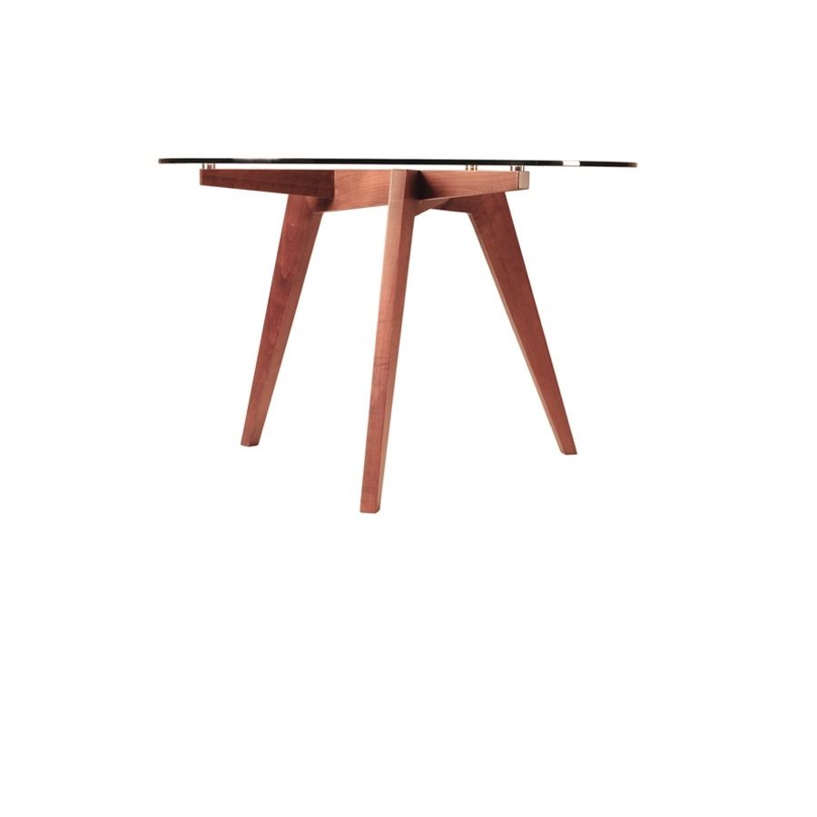 Glass top and legs made of cherry wood in a ""boomerang"" shape dovetail joint assembly.
