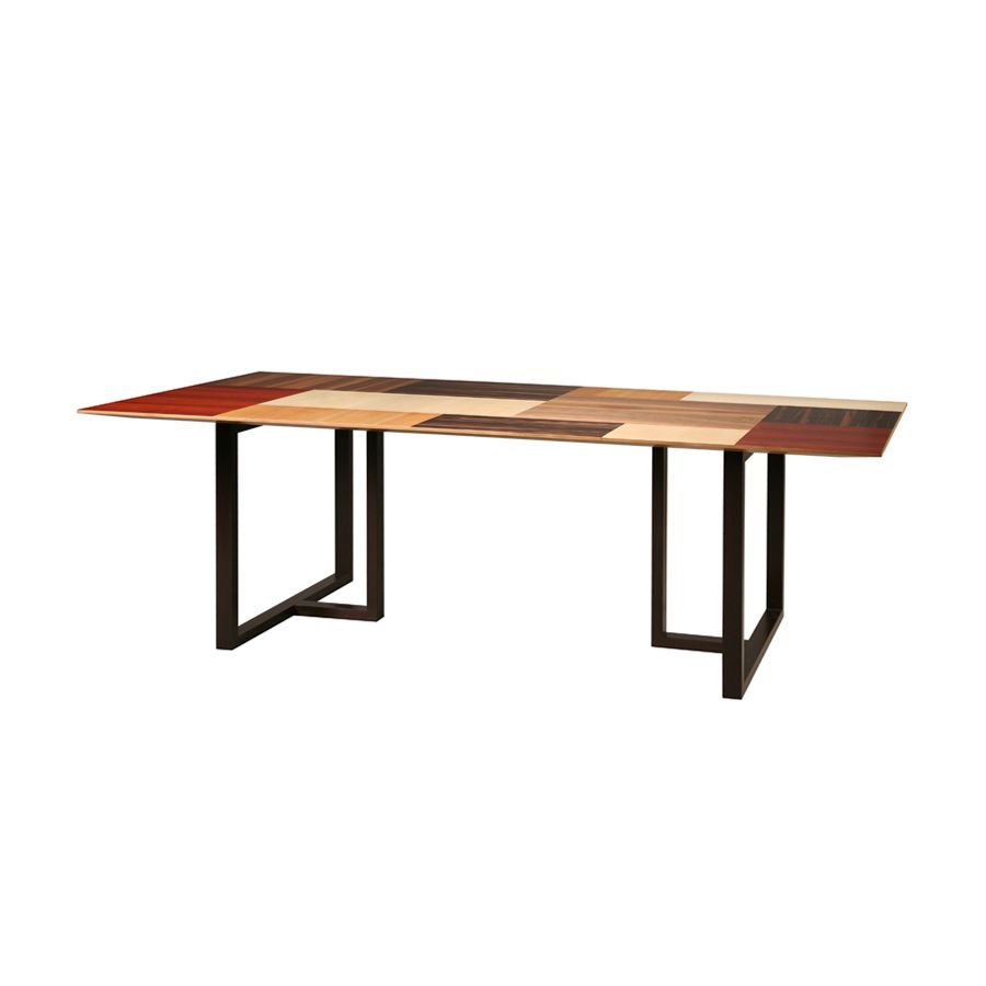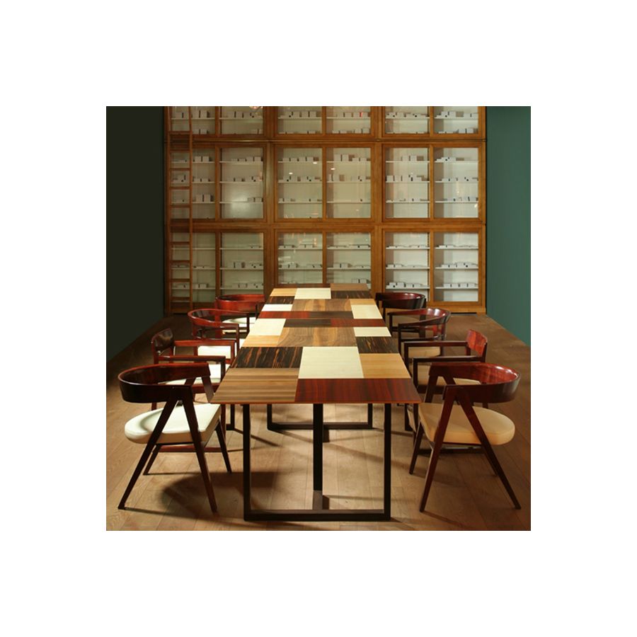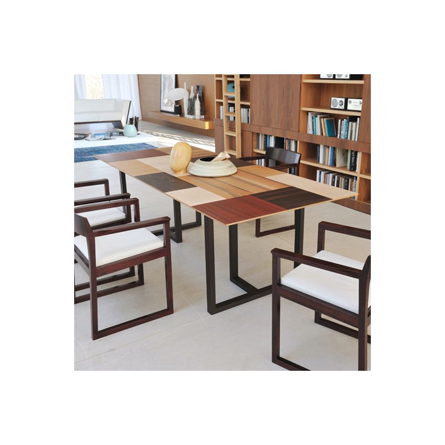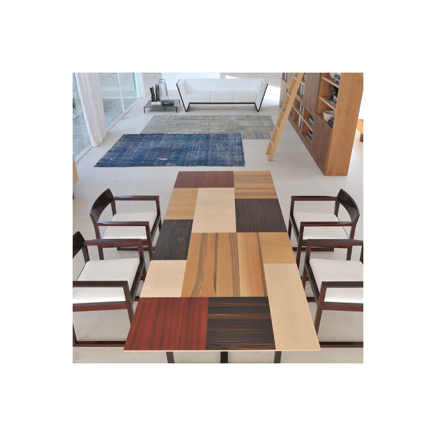 Fixed table made of wengè wood. The top veneered with makassar ebony, walnut, maple, cherry and padouk. Splay cut top. Legs made of solid wengè. The Patchwork collection designed by Maurizio Duranti for Morelato is intended as a collection able to express the concept of modern furniture but at the same time remaining in the field of skillful cabinet making.