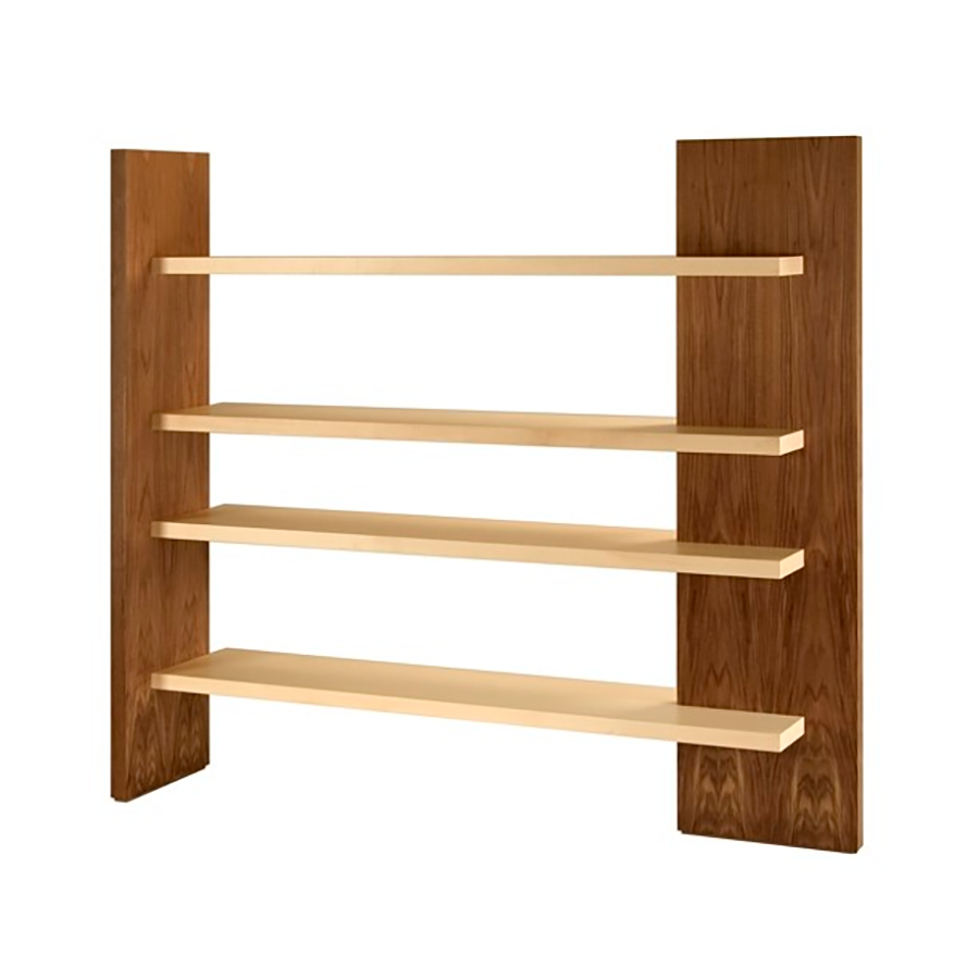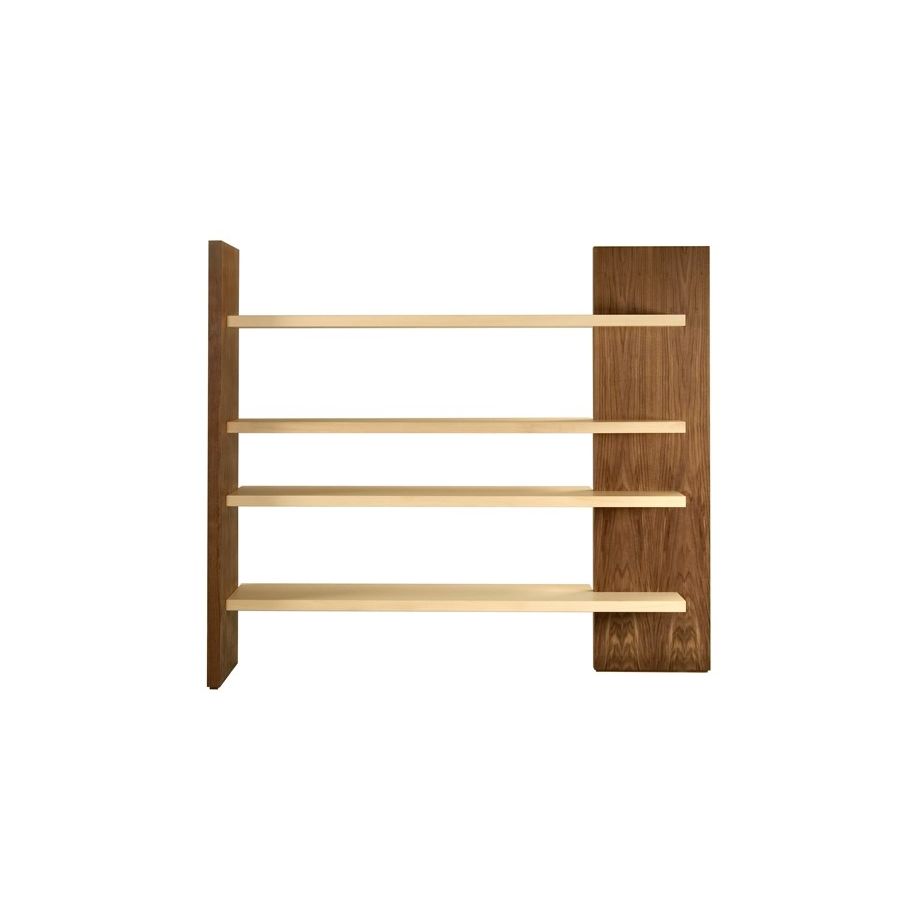 Freestanding bookcase with 2 double face vertical elements and 4 shelves in walnut and maple, thickness of 4.5 cm.