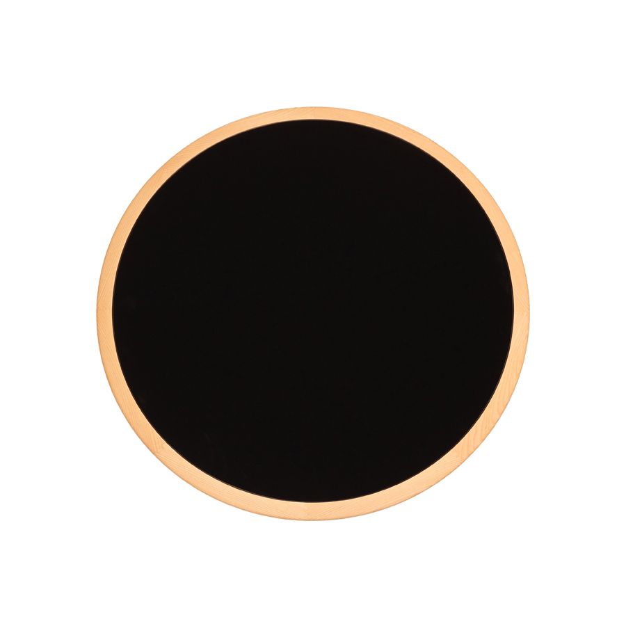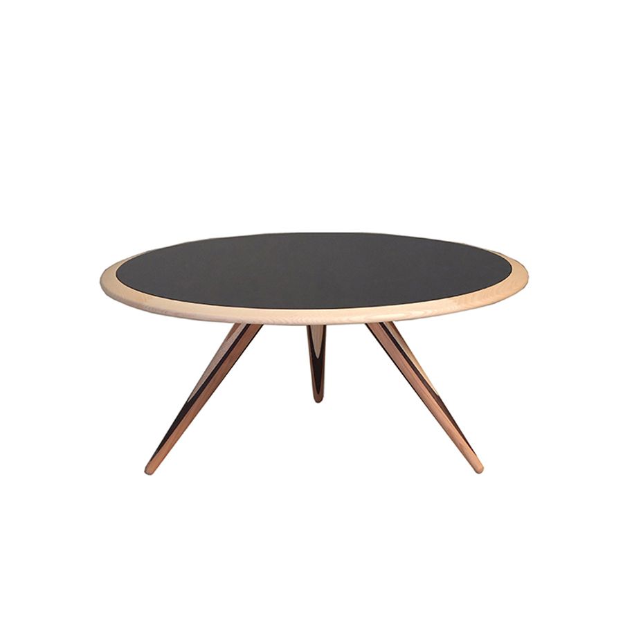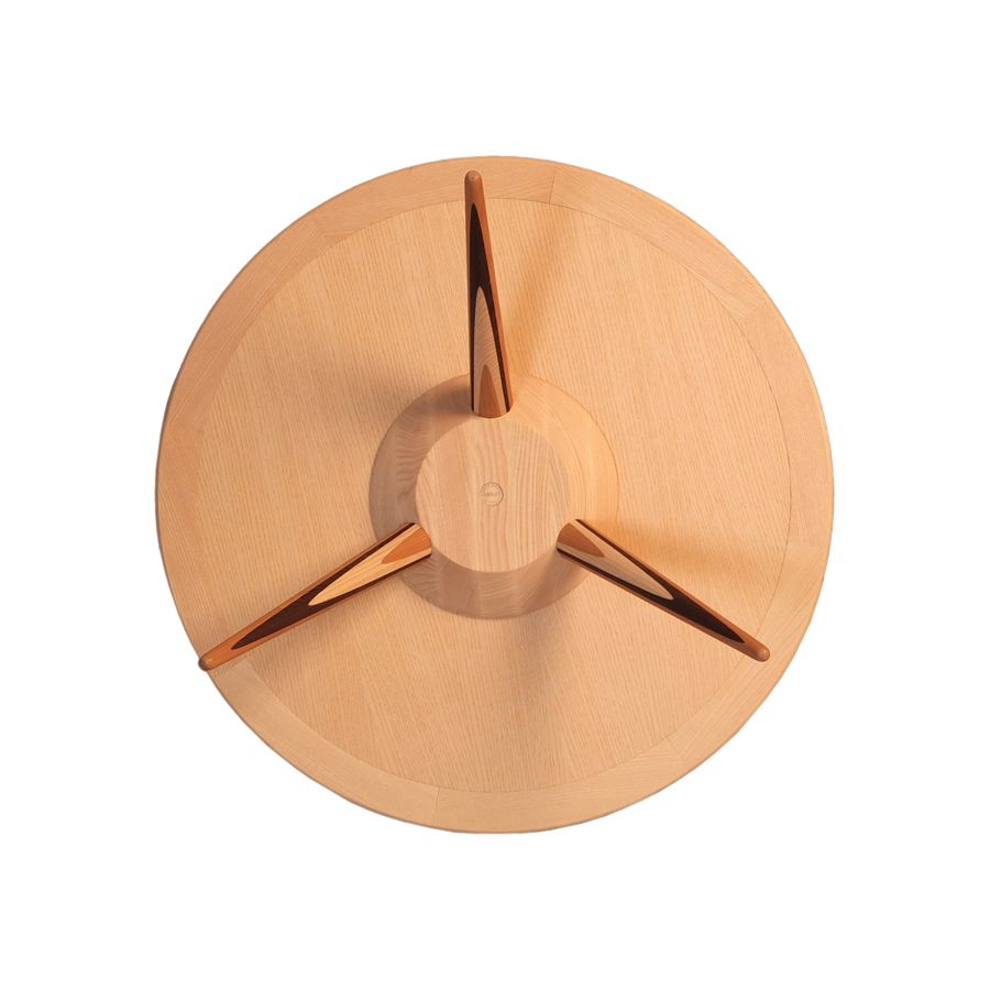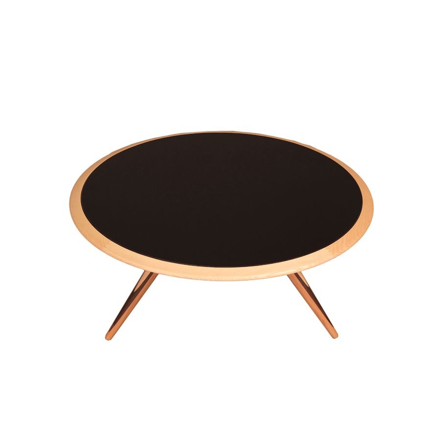 Coffee table with round ash wood top and glass insert. Turned legs in the shape of biliard cues made of cherry, wengè and maple. Customizable top finish, with central glass insert upon request.