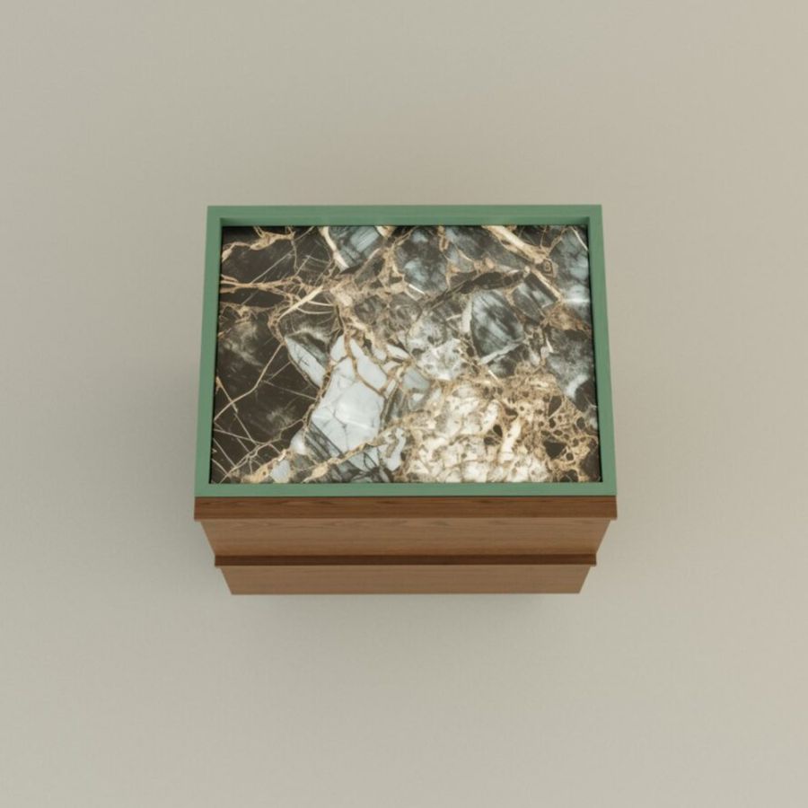 Ash wood cabinet with two drawers on metal guides, marble top.