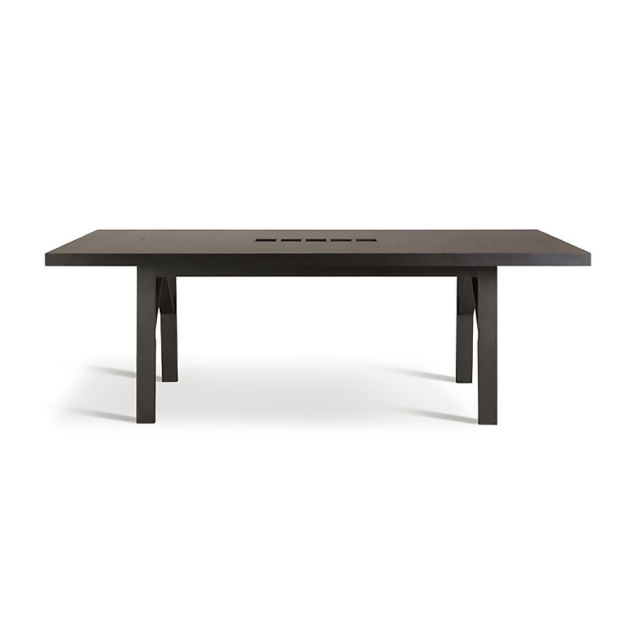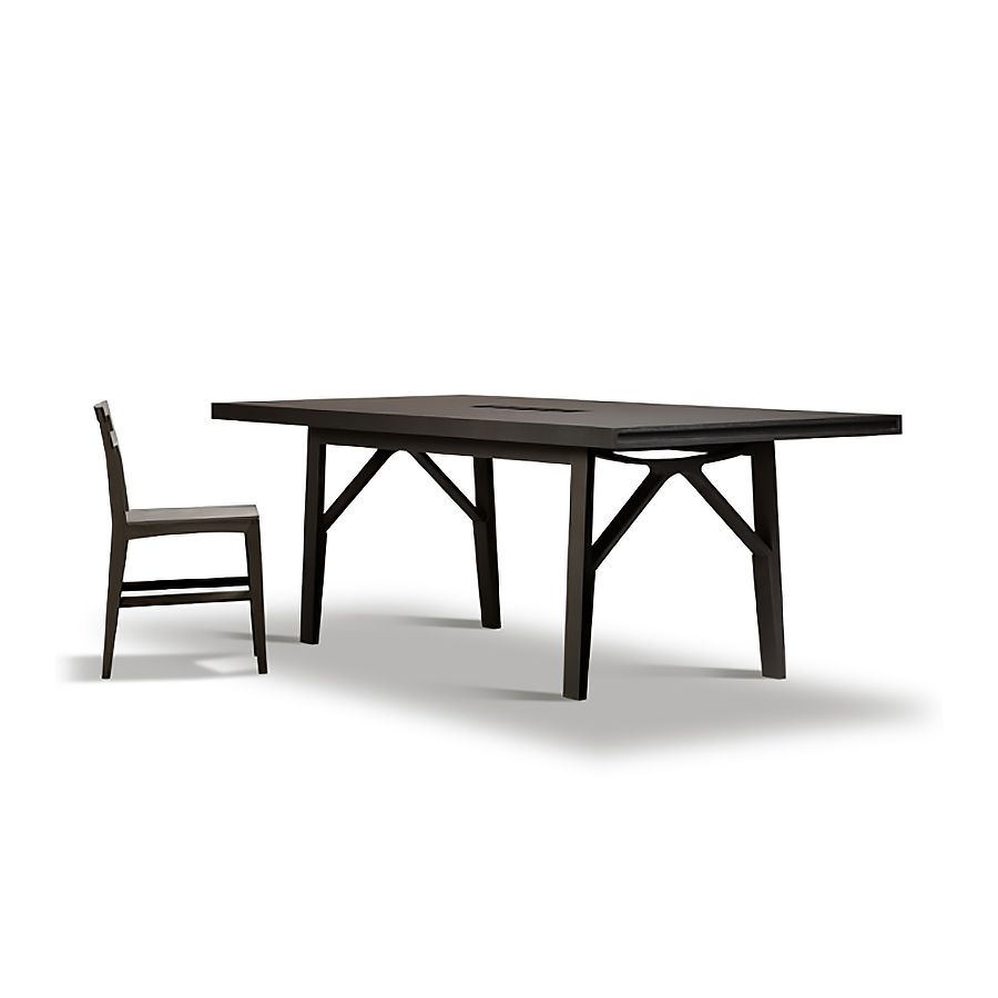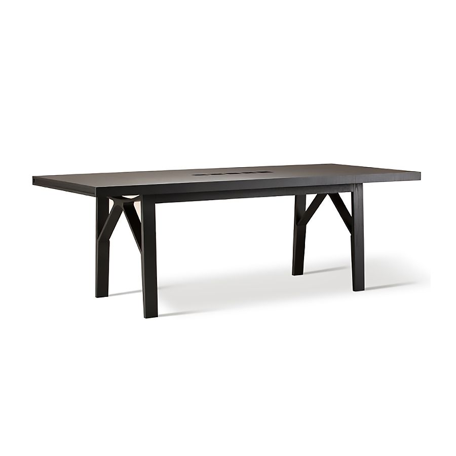 Table made of ash wood with fork shaped legs, and table top with veneer pattern decoration. In the middle 5 removable trays. The designer Franco Poli has designed a new and original table for Morelato. The Campo is characterized by a severe geometry of forms, contrasted by the natural movement of the ash wood of which the table is entirely made, as you the tabletop clearly shows. Supported by special fork shaped legs, the Campo can be used both as a table and as a spacious desk with five removable tray in the center of the top.