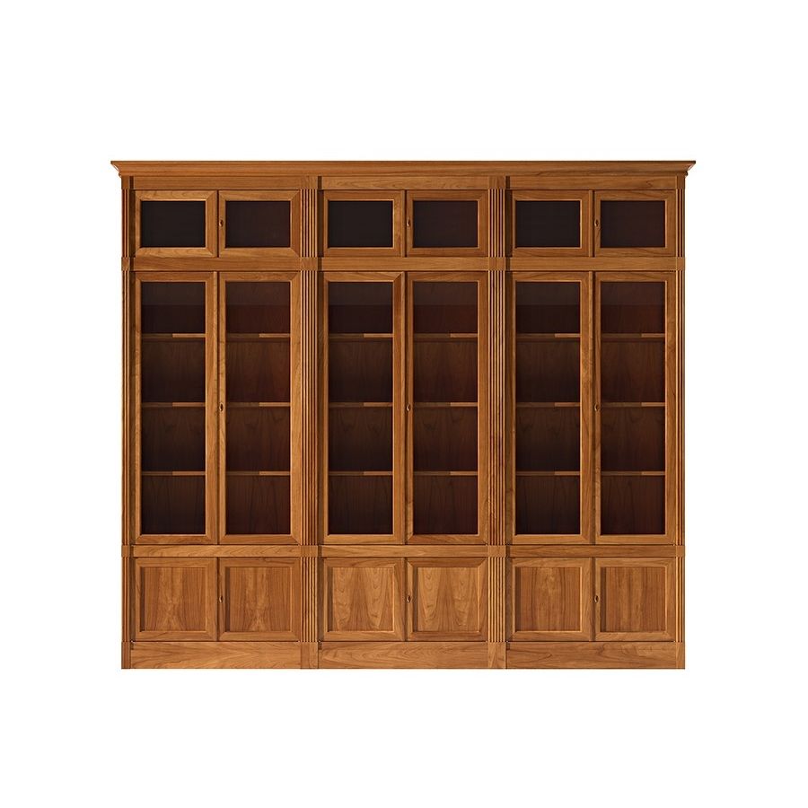 Proposal for Direttorio modular bookcase made of cherry wood. 3 central elements with glass and wooden hinged doors; 3 upper glass doors elements. Adjustable shelves on wooden support.
