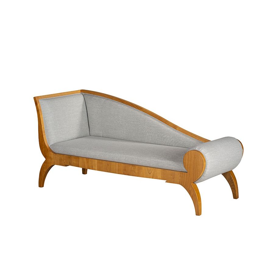 Chaise longue made of shaped cherry wood. Upholstered seat and back in leather or fabric.