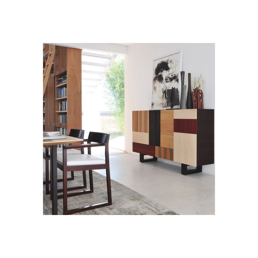 Sideboard made of wengè wood with internal shelves made of ash. 4 doors and 2 drawers veneered with essences of Makassar ebony, walnut, maple, cherry and padouk. The Patchwork collection designed by Maurizio Duranti for Morelato is intended as a collection able to express the concept of modern furniture but at the same time remaining in the field of skillful cabinet making.