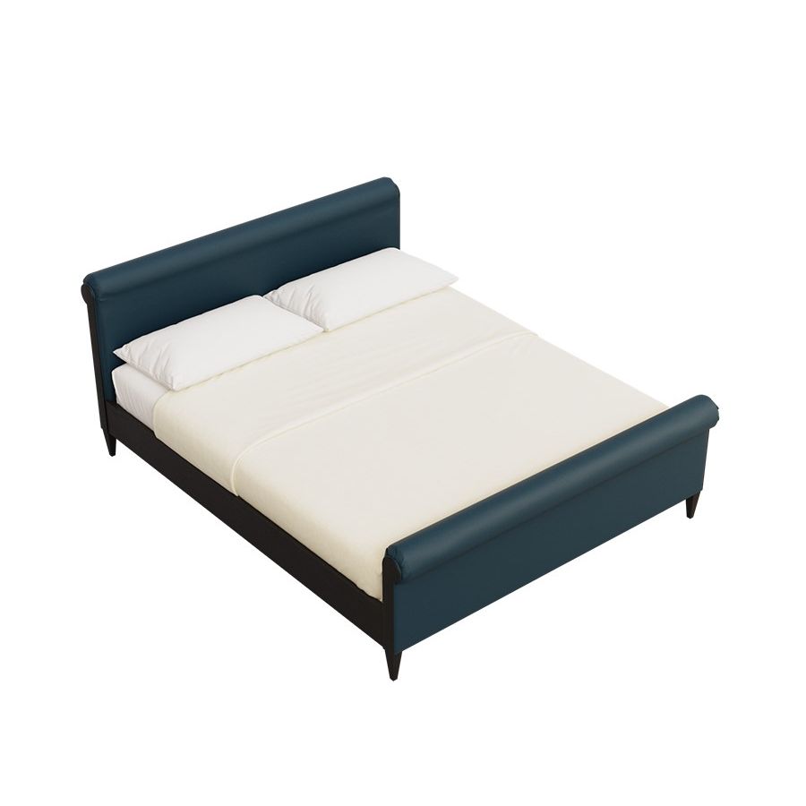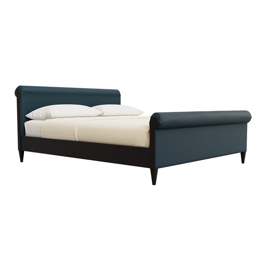 Upholstered bed made of cherry wood. Leather or fabric upholstering on headboard and footboard. Wooden slats mattress support.