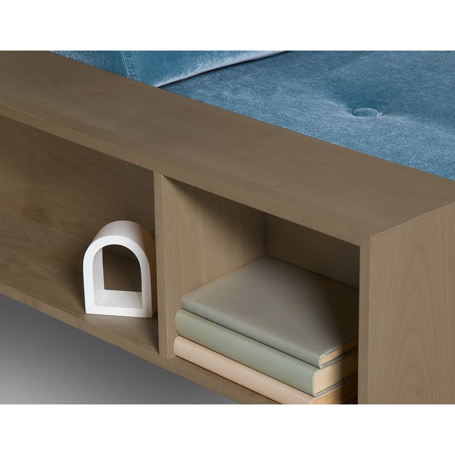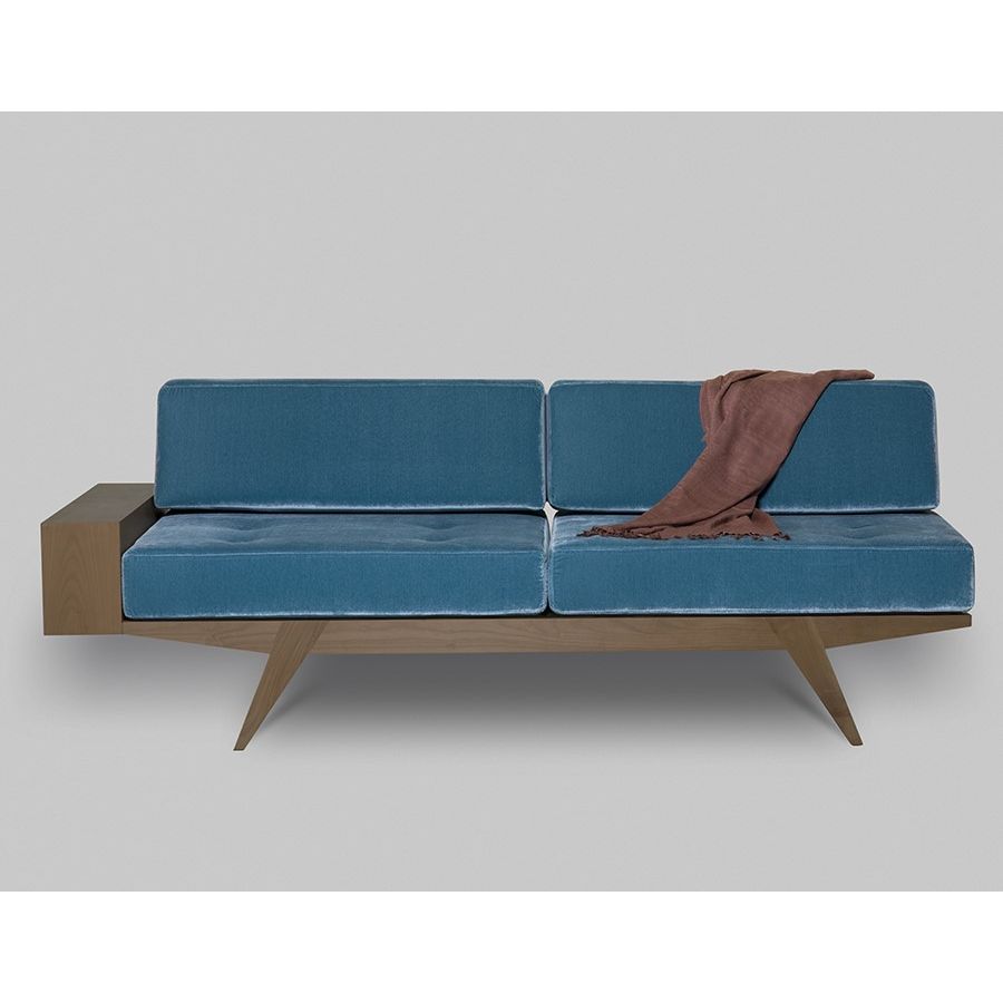 Sofa bed with cherry wood frame and armrest with storage compartment. Cushions upholstered with leather or fabric. Upon request made of walnut wood.