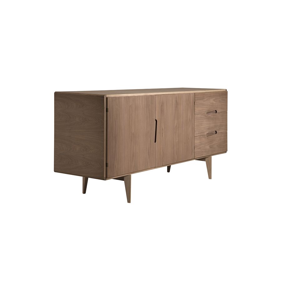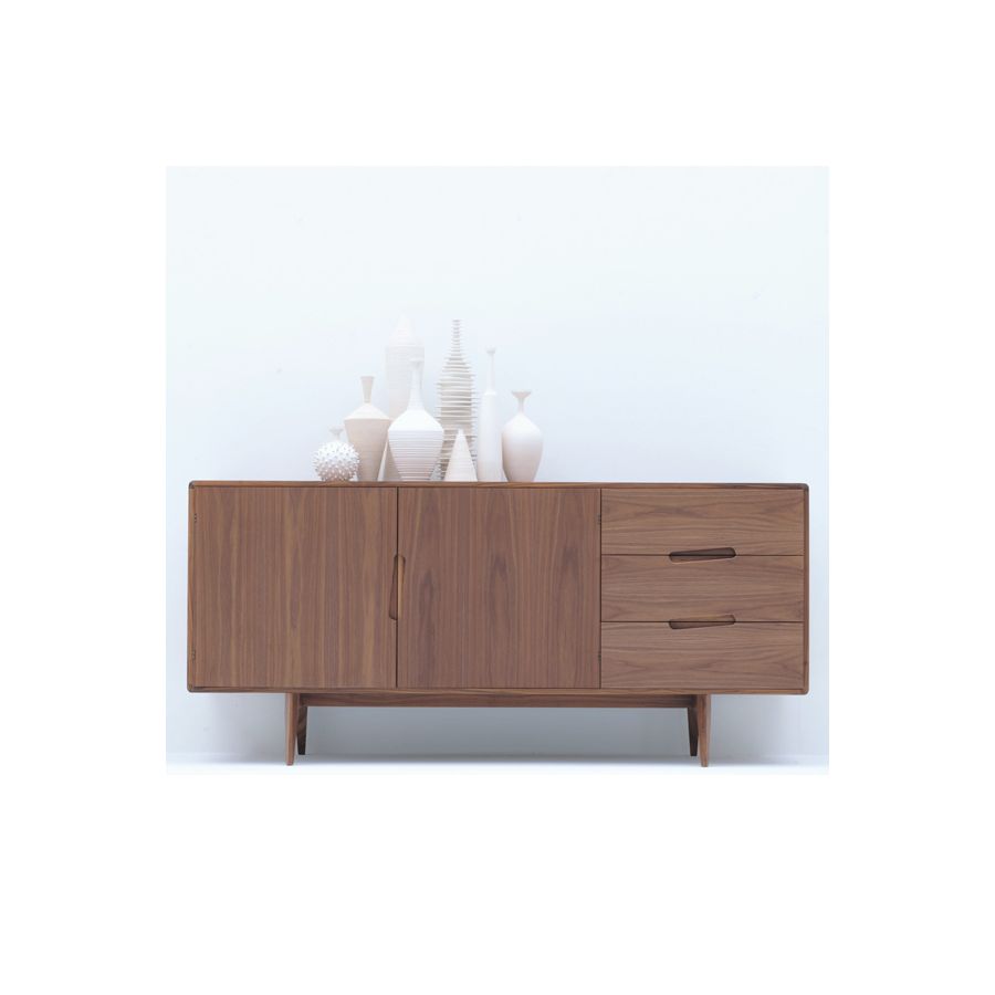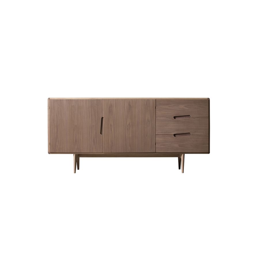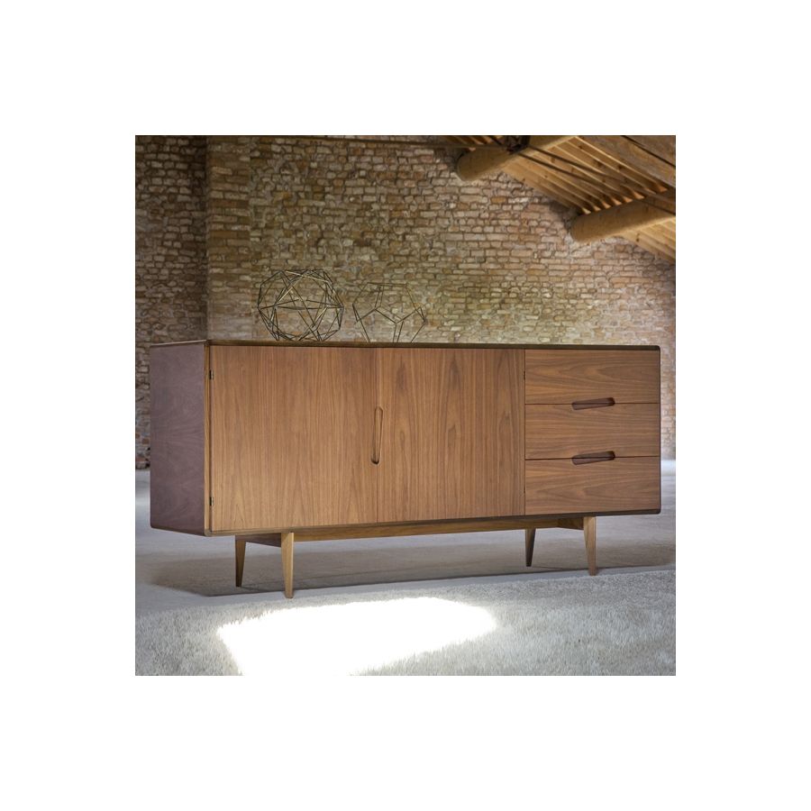 Walnut sideboard with 2 doors, 1 adjustable shelf and 3 drawers with metal runners. Particular diagonally inlaid handles. Base frame with wooden legs with a triangular section. The Californian furniture of the sixties and seventies inspired the Malibu’ collection. The collection was designed by the internal MAAM Research Center, engaged in the constant research and development of unique high quality products. Malibù is a vast collection for the living room area, with sideboards tables and chairs but also for the bedroom with beds, and complementary elements able to give originality and freshness to any corner of the house.