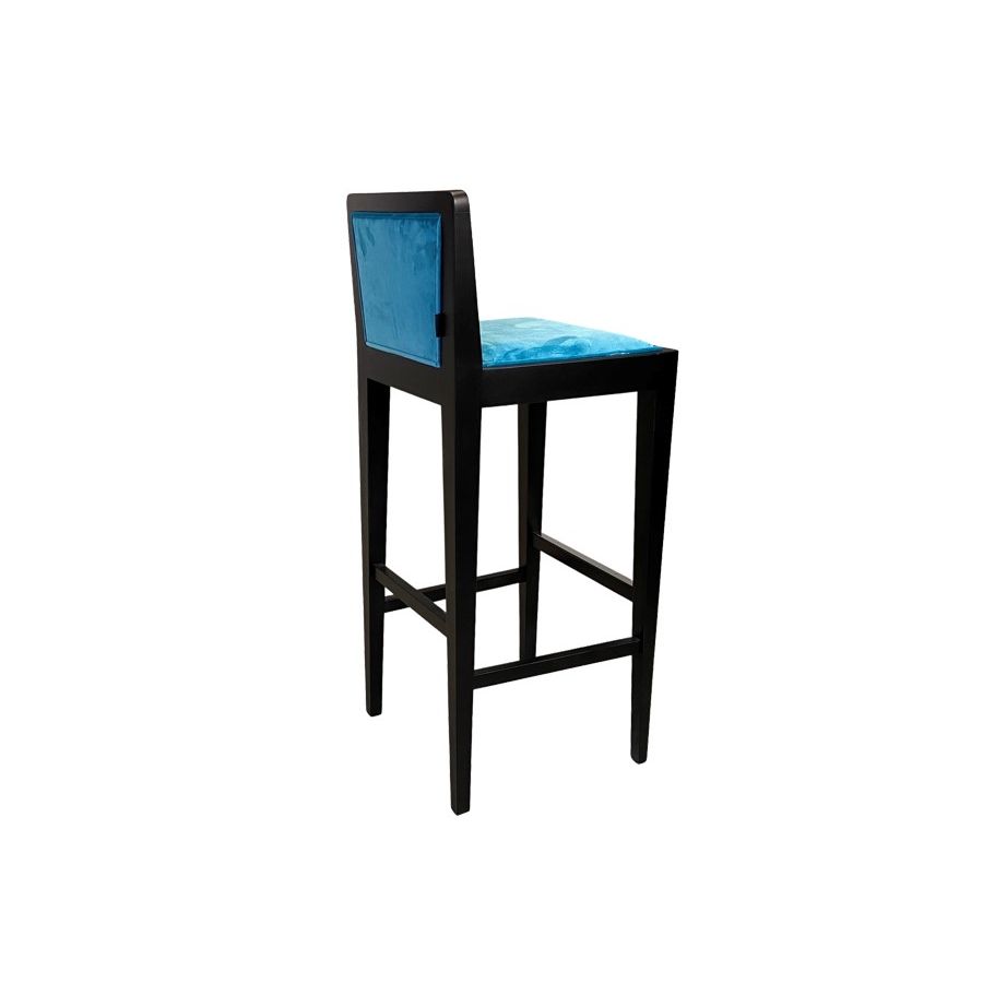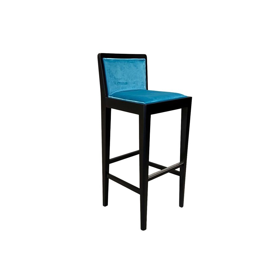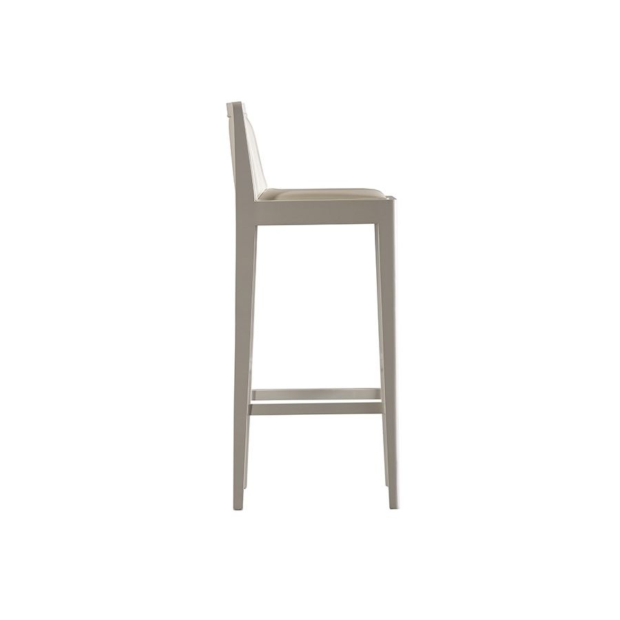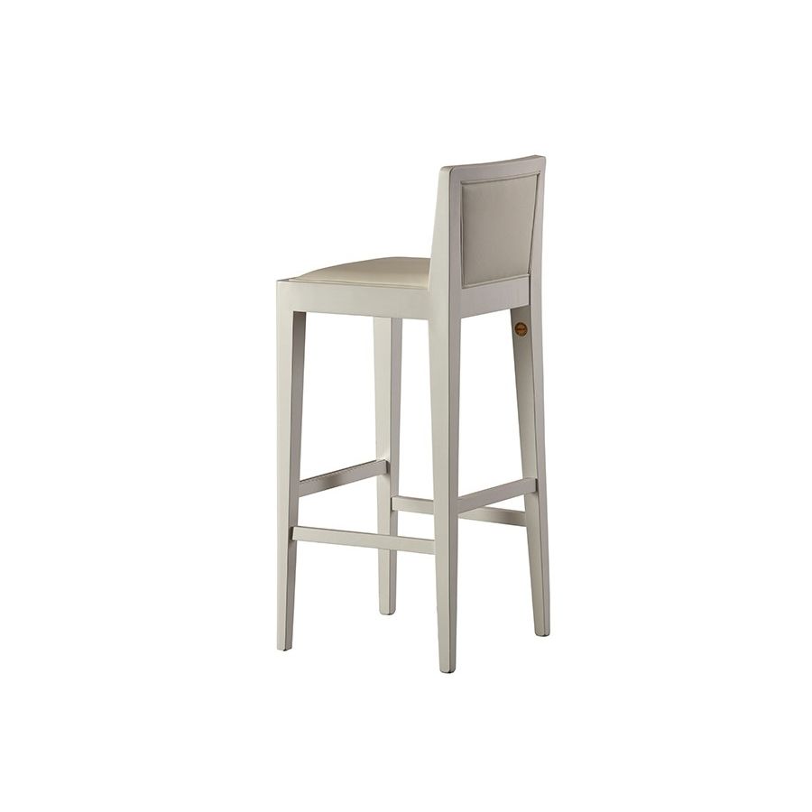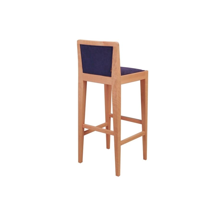 Stool made of cherry wood with upholstered seat and back, in leather or fabric. Upon request steel footrest.