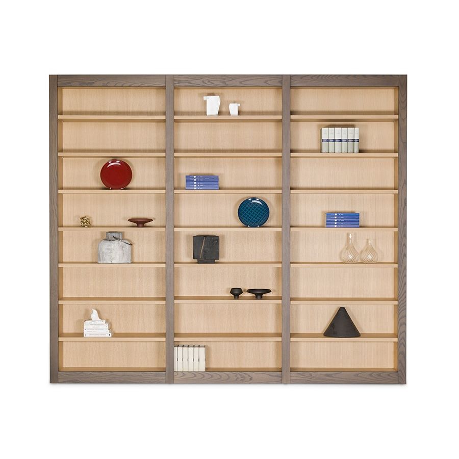 Open bookcase in ash wood made up of three modules with internal shelves adjustable in height.