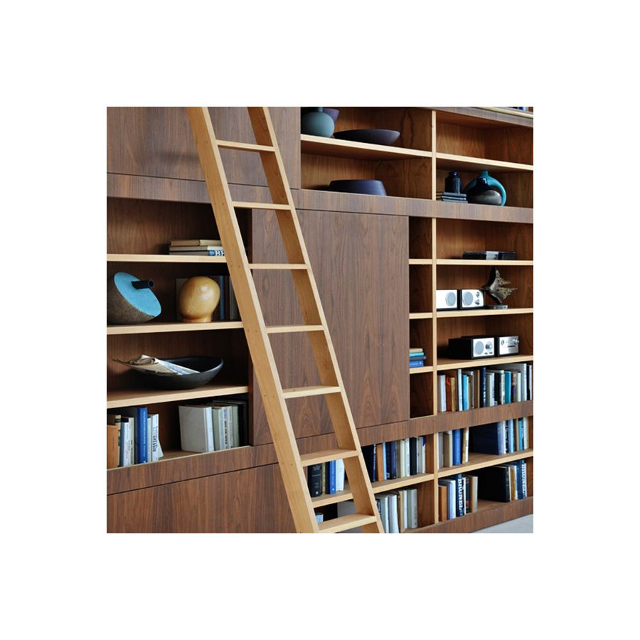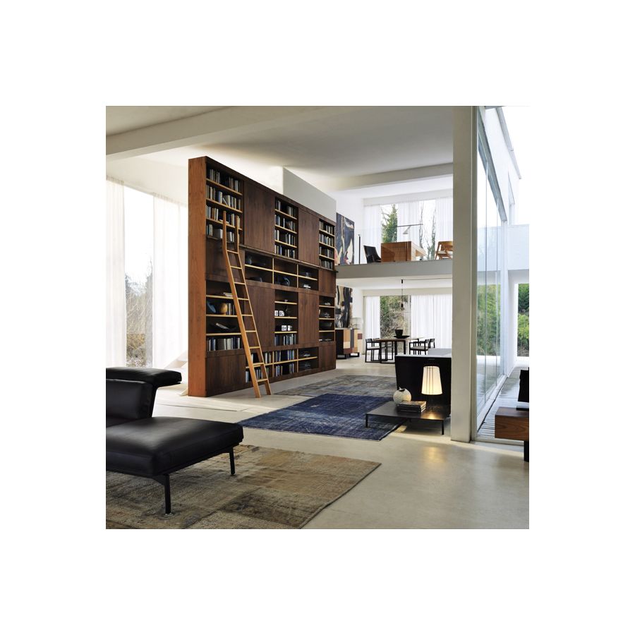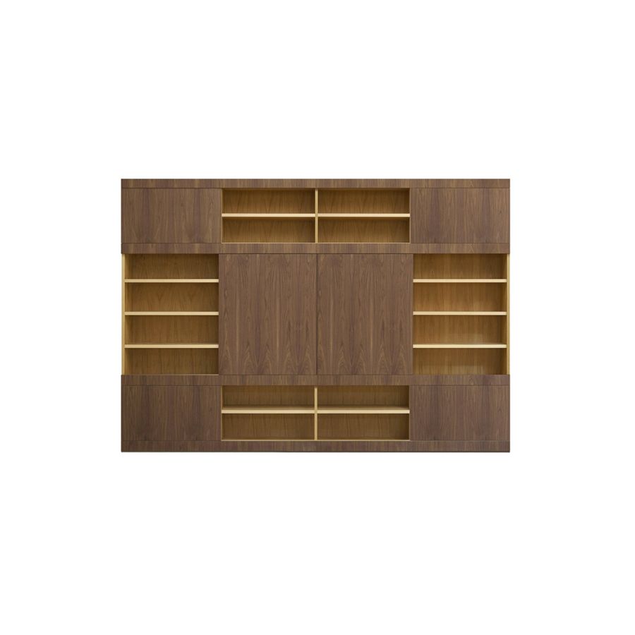 Proposal for a modular Mask bookcase. Internal 4-elements open structure made of cherry wood with adjustable shelves, 2 big sliding doors and 4 small sliding doors made of canaletto walnut wood. The Maschera system offers a wide range of proposals. Inspired by figurative themes of the tradition the system is designed for the needs of contemporary living. Its mutable character regarding colors and wood types makes the wall unit fit for any architectural ambience as furnishing protagonist or a neutral background.