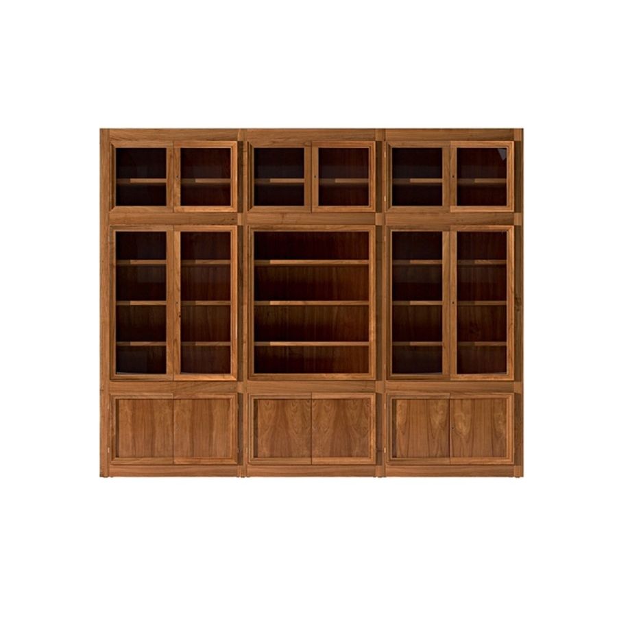 Maschera wall unit composed of three elements, frame and doors made of cherry wood. Three wooden doors and 5 glass doors. Internal shelves are adjustable.