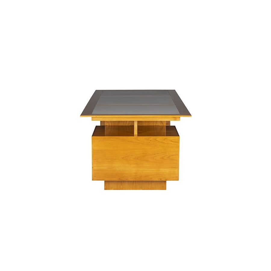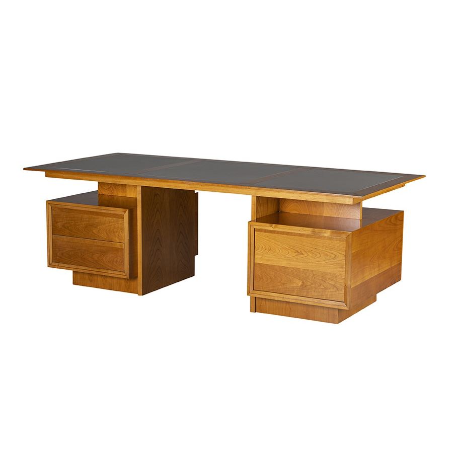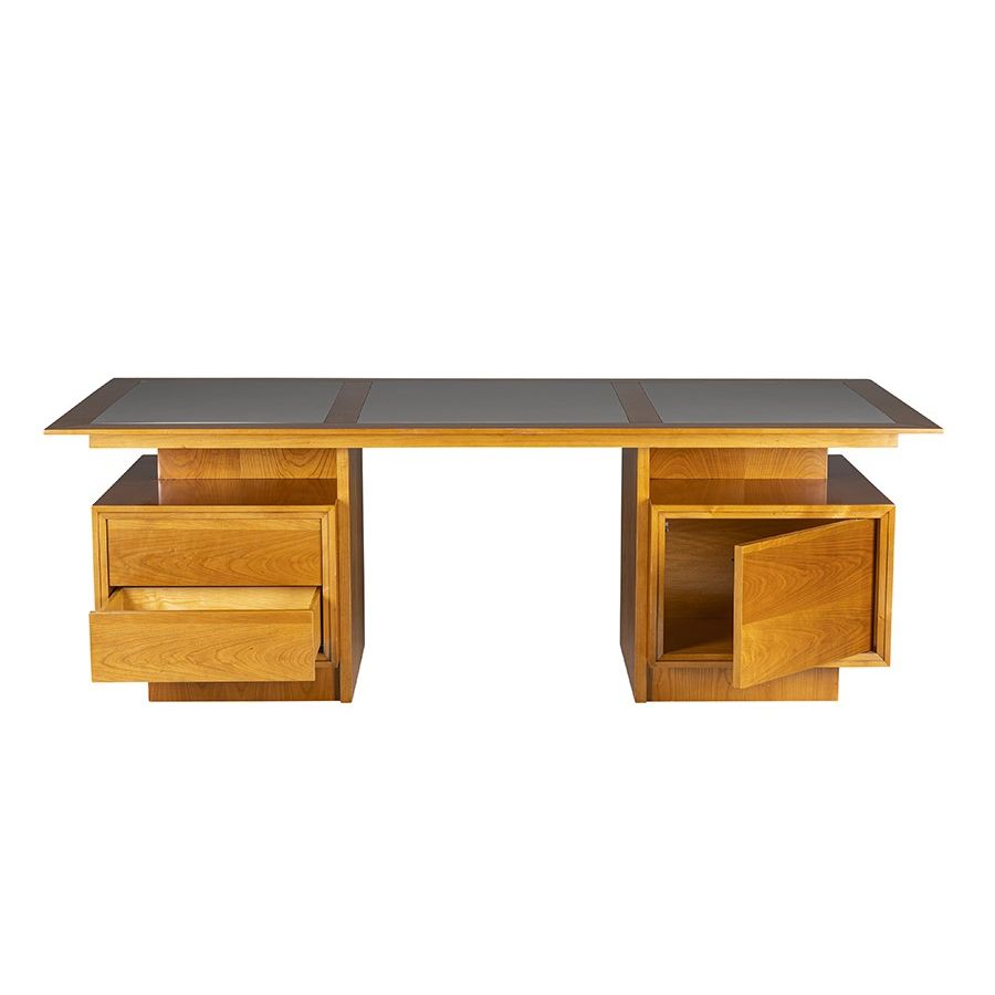 Double sided writing desk with two base parts containing larg modules with door and drawers. Top with precious leather insert.