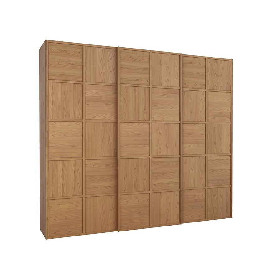 Wardrobe with 3 sliding doors made of cherry wood with a fine checkerboard decoration. Inside: 5 adjustable shelves and 5 clothes rails. Accessories on request: chest of 3 drawers, tie rack, trouser rack, electronic safe, lifting hanging.