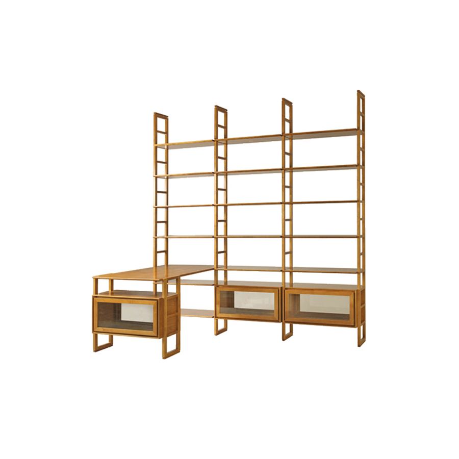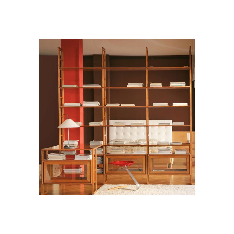 Proposal for modular Scala Zero bookcase, with 4 uprights made of solid cherry wood, 3 adjustable shelves and storage units with double sided hinged glass doors and desk. The Zero modular system offers furnishing solutions not only for home spaces but also for offices. Placed together, hanging, horizontal or vertical, with doors or drawers to choose from a wide range of colors and patterns, the Zero modules are made for the creativity of those who seek innovative, elegant, functional furniture solutions. The elements, finished on all sides, lend themselves to any type of composition. The artisan care of the single modules are clear to the eye and to the touch. Made of plywood and solid cherry hardboard, the Zero combines the flexibility of the module with the quality of the material, for transformable and everlasting furnishings.