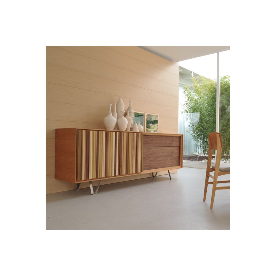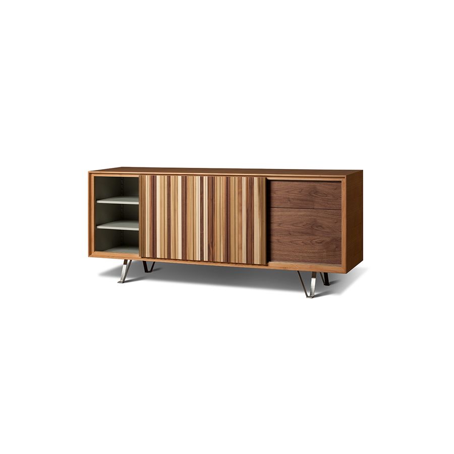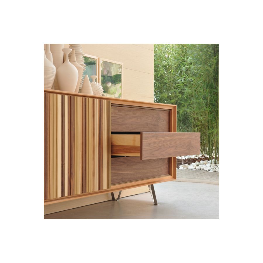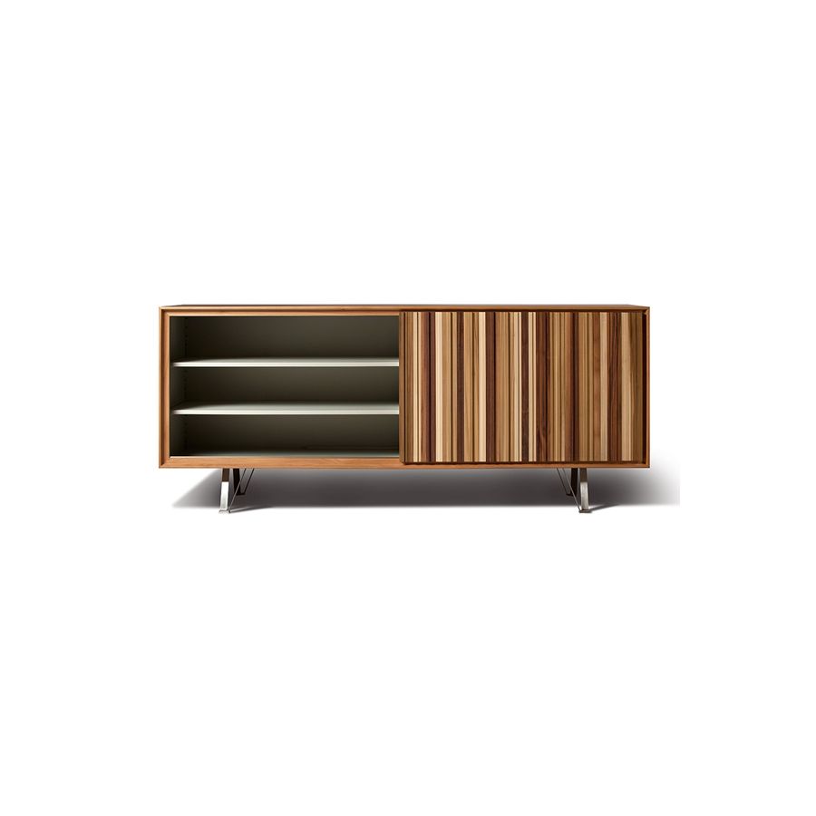 Sideboard made of cherry wood with 1 "Code" sliding door, 2 internal adjustable shelves and 3 drawers with push&pull mechanism and Canaletto walnut front. Upon request structure in canaletto walnut. Sipario introduces the sliding door to the sideboard. By using different wood types for the lists of wood on the door an interesting and balanced movement is created. The internal space has been cleverly divided in drawers, with a precious walnut panel and a large open space with adjustable shelves.