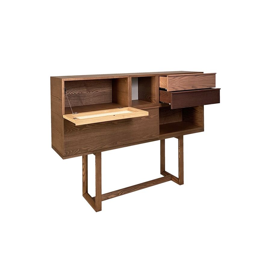 Ash wood console table composed of modules with drawer and open modules, base with wooden structure.
