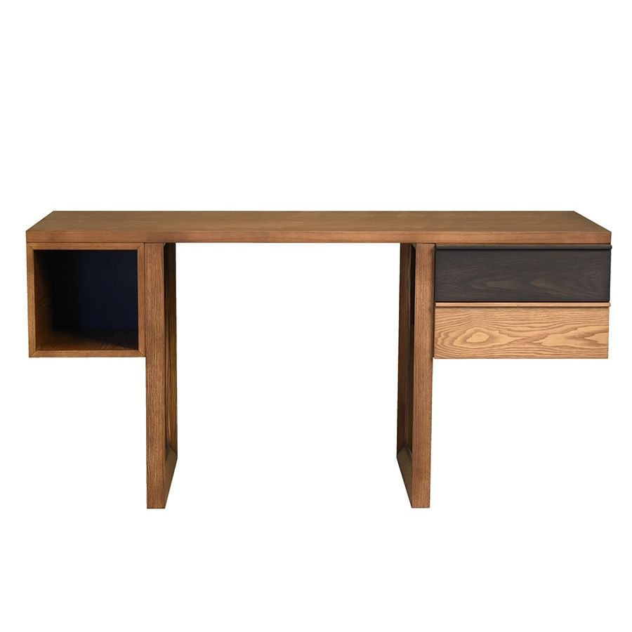 Ash wood desk, two drawers on the right, one open compartment on the left. Two open compartments on the back. Colored interior.