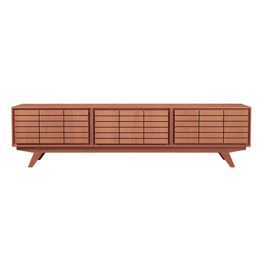 TV stand sideboard with a 3 rooms Zero element, 2 drawers and 1 central flap door with brick inlay decoration on the front. Available with doors, legs and accessories of the Zero collection.