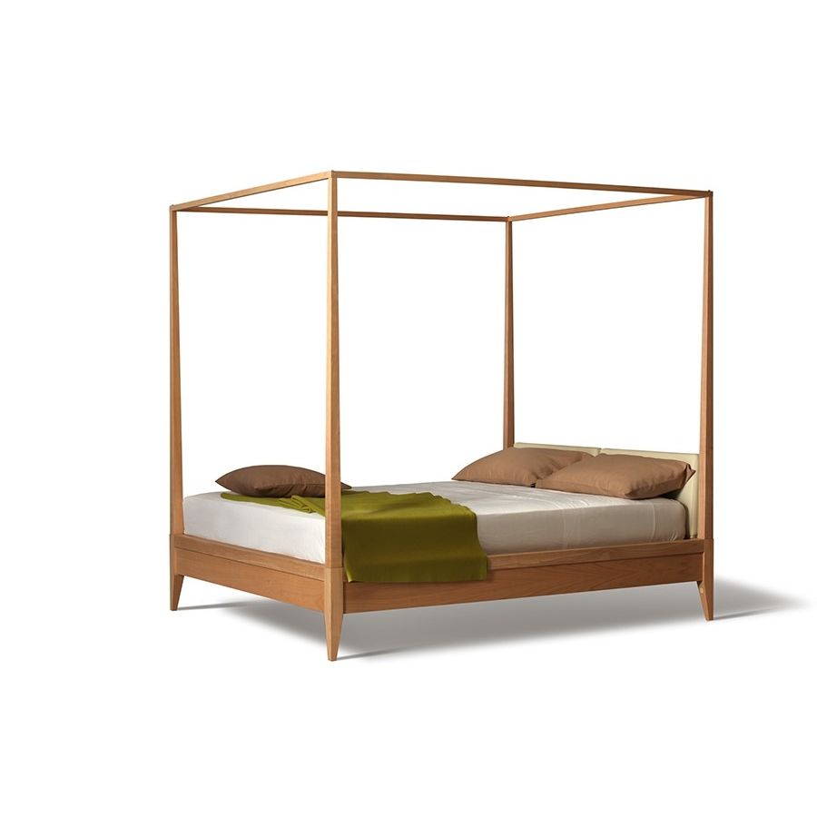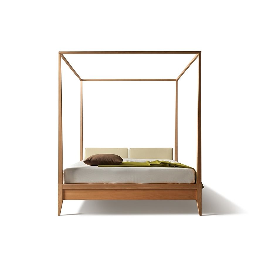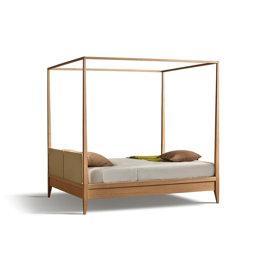 Bed made of cherry wood with fabric or leather upholstered headboard and baldachin. Wooden slats mattress support. On request also available in ash wood, art. 2891/F