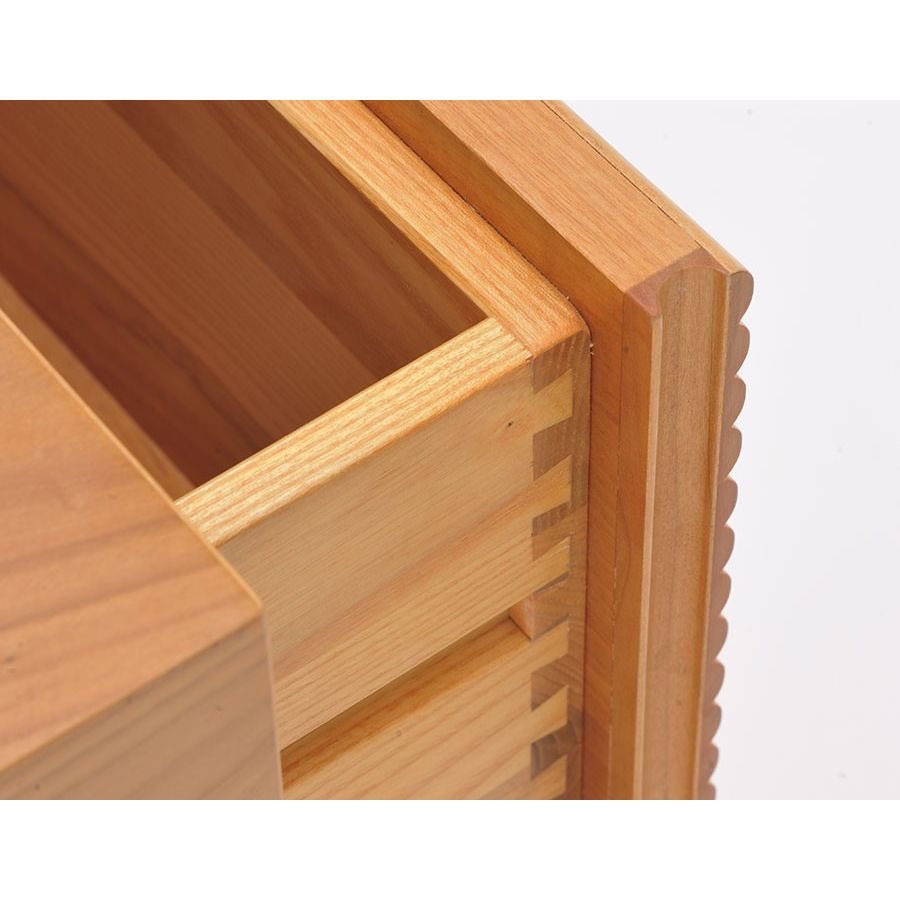 Proposal for Zero composition consists of 1 cherry wood base element with 3 drawers, 3 cabinet elements with glass hinged doors.