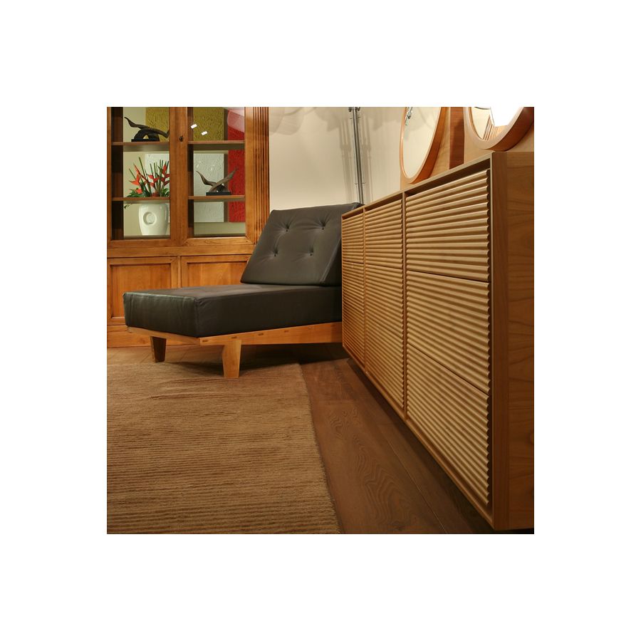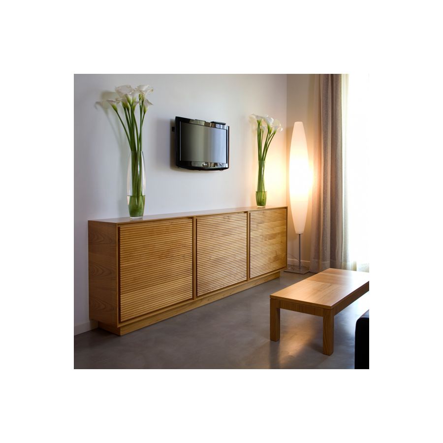 Sideboard made with a 3 compartment Zero structure art.3470 and 3 doors with wooden strips milling art.3459. Adjustable shelves. Available with doors, drawers and accessories of the Zero collection. With the Zero Morelato has created a young collection of unique design. Perfect to furnish any home space or office. The spacious cabinets are completed with doors or drawers that can be selected from a wide range of colors and patterns, with the aim to offer new design solutions suitable for any type of housing.