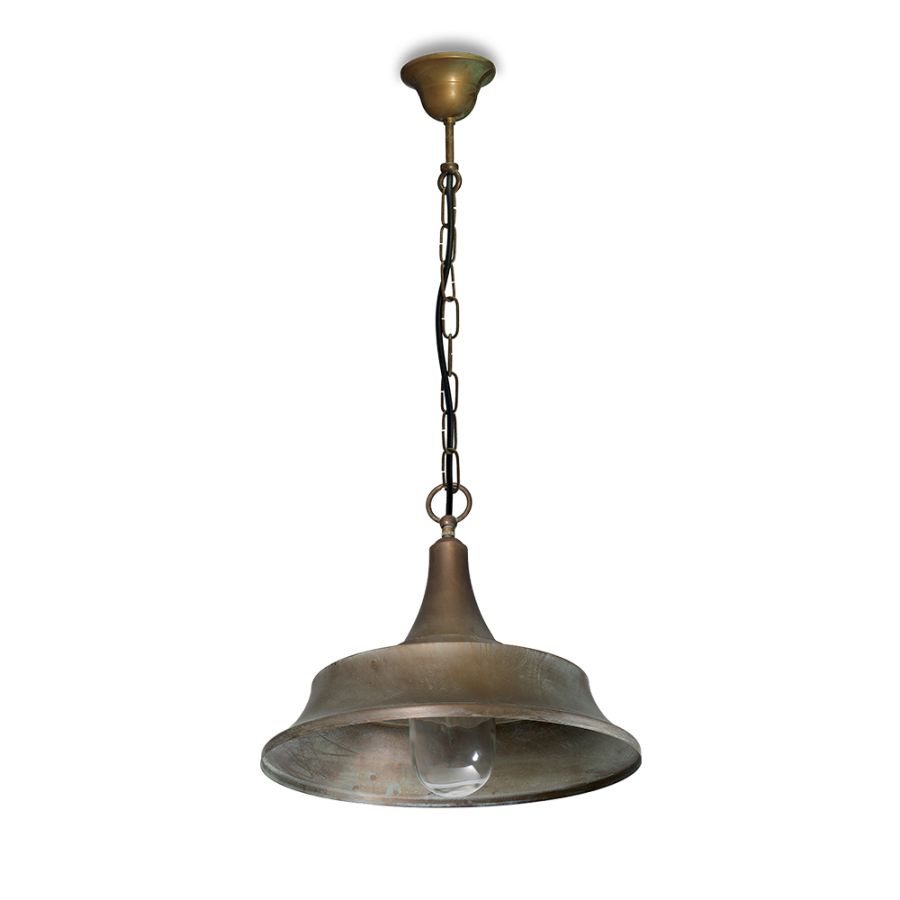 Hängande graciöst i en robust mässingskedja har denna lampa en transparent glasdiffusor som säkerställer ett klart och inbjudande sken. E27-lampfattningen är kompatibel med energieffektiva LED-lampor, vilket möjliggör betydande energibesparingar jämfört med traditionella glödlampor, samtidigt som den erbjuder mångsidiga belysningsalternativ för dina utomhusytor.