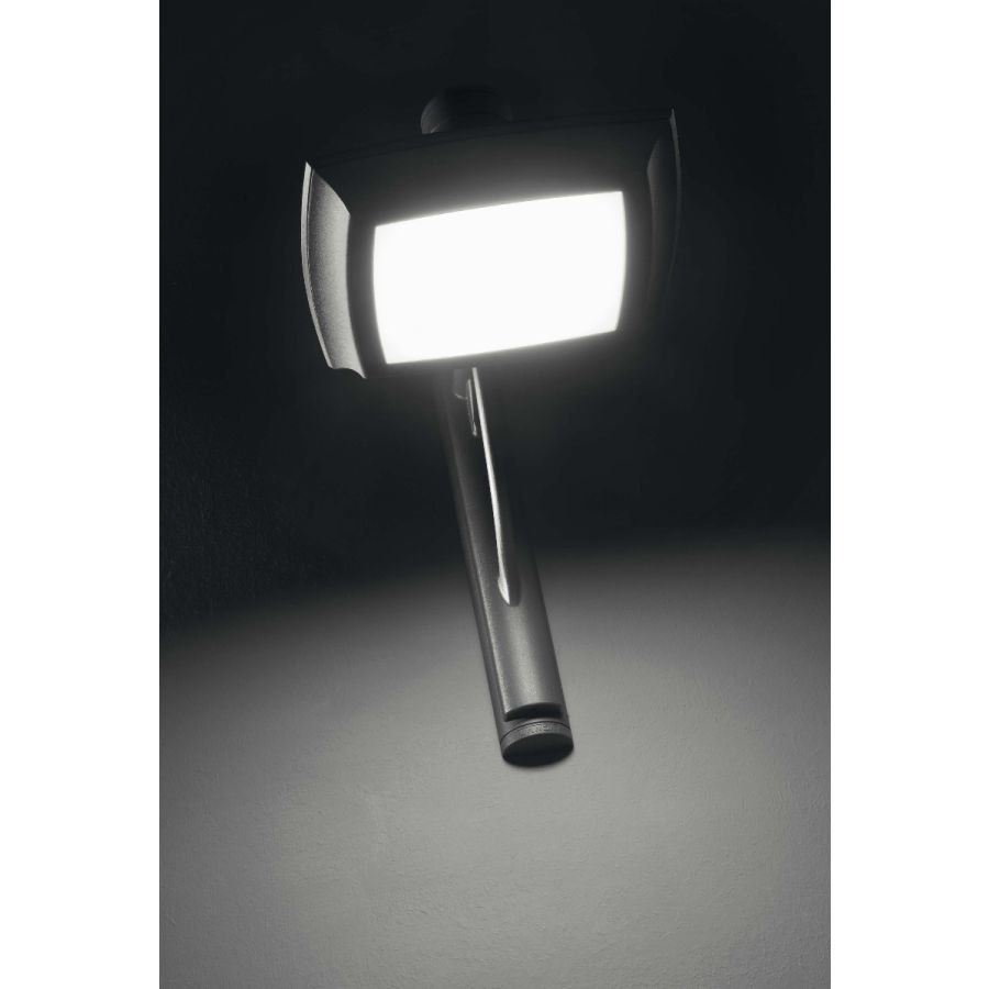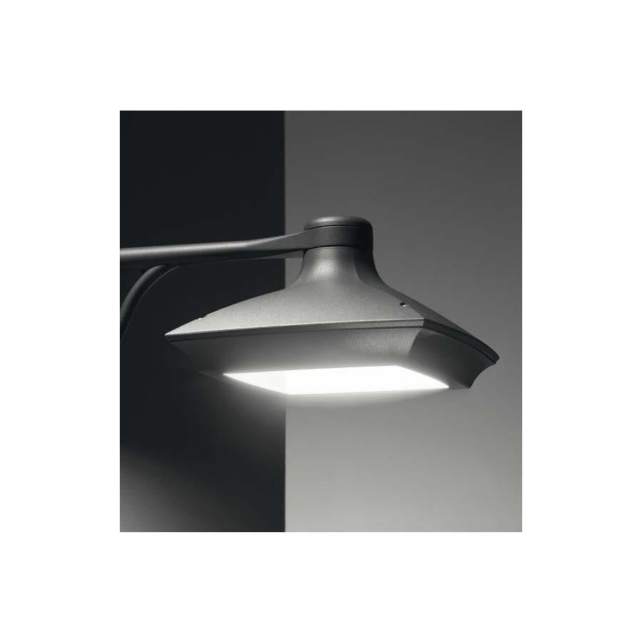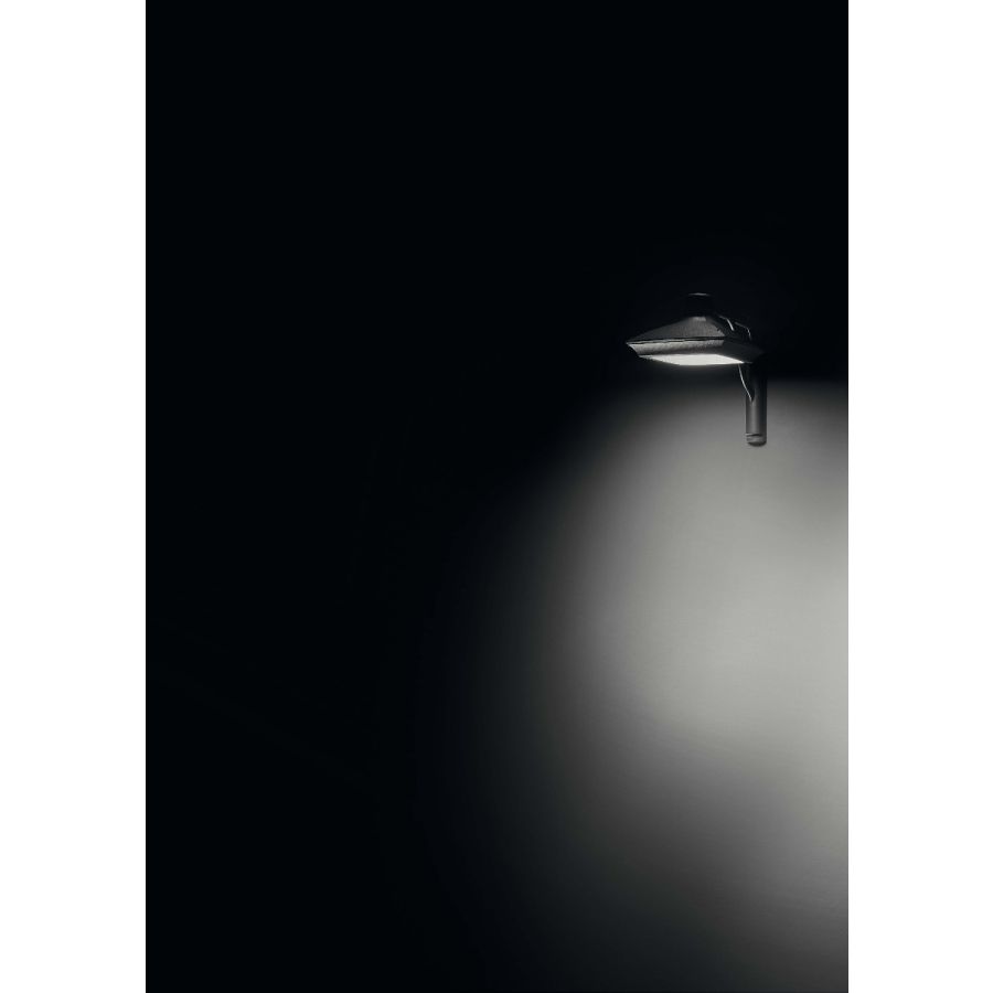 Utrustad med en 29W power output och ett diffust optiskt system, har denna armatur en opal polykarbonatdiffusor som levererar mjuk men ändå genomträngande zenital belysning. Den väggmonterade installationen underlättas av en 90° aluminum arm, vilket säkerställer både stabilitet och en diskret, kompakt profil. Designen prioriterar rena linjer och minimal inverkan, vilket gör den lämplig för en rad utomhusapplikationer, från bostadsfasader till gemensamma utrymmen.