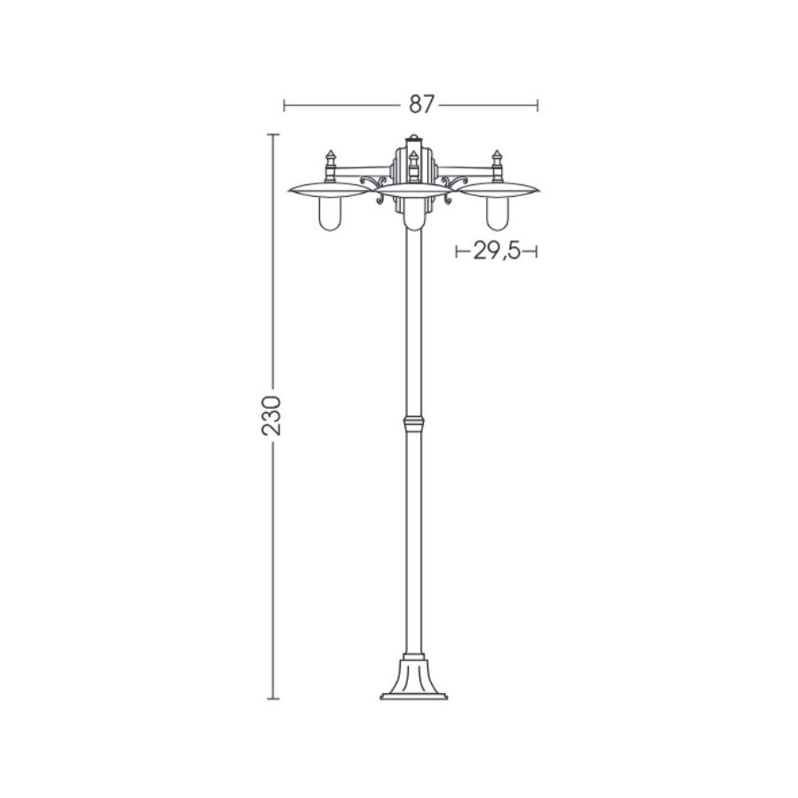 Tillverkad av slitstarkt tryckgjutet aluminium har denna sofistikerade utomhusarmatur tre lamphuvuden, vardera utrustade med en E27-sockel som är kompatibel med energibesparande ljuskällor.