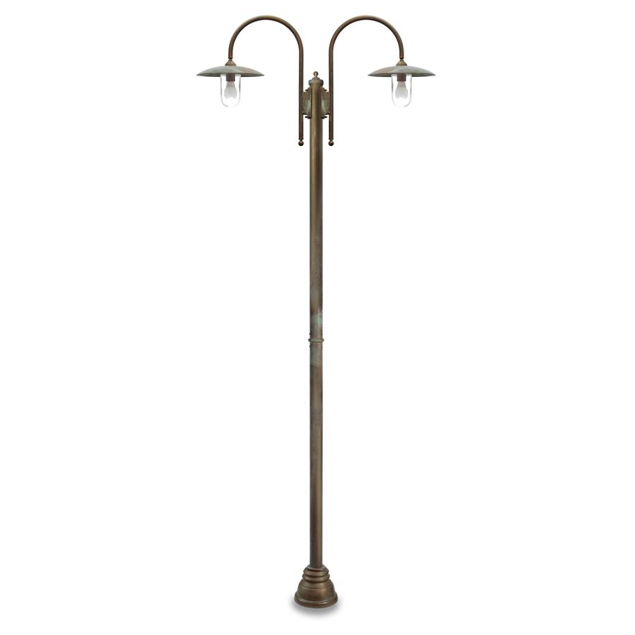 Upplys ditt utomhusområde med elegans och funktionalitet med Trasimeno mässingsstolpe med 2 lampor från Moretti Luce. Stående på en imponerande höjd av 270 cm kombinerar denna lampa klassisk skönhet med robust konstruktion, vilket gör den idealisk för både bostads- och offentliga utomhusmiljöer. Stolpen är tillverkad av pressgjuten mässing, med alternativ för antik kopparpläterad mässing (.AR) och mörkbrun (.BA) ytbehandling, vilket säkerställer att lampan tål de hårdaste förhållandena, inklusive kustmiljöer, snörika regioner och områden med kalkrikt vatten.
