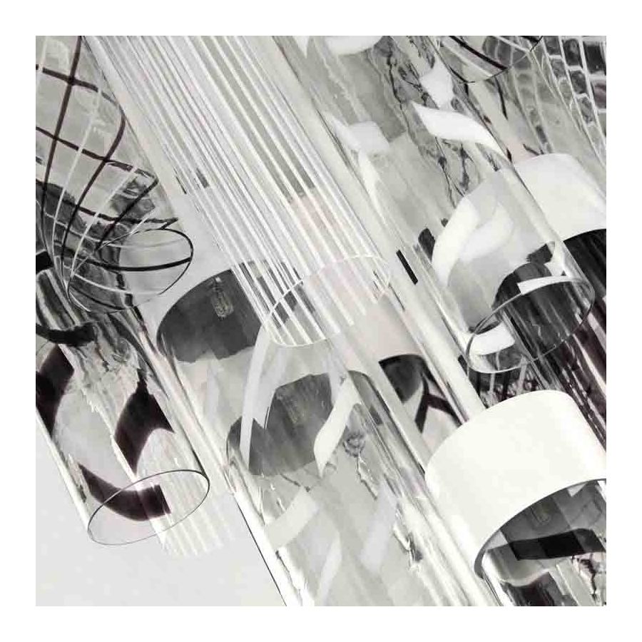 This modern lighting fixture is characterized by a wide variety of decorations on the glass of the tubular elements; these are the decorations typical of the glass objects (such as glasses, vases, etc.) In the multitude of elements and decorations, the coloration gives uniformity to the structure: all the decorations are made in black and white on crystal glass.