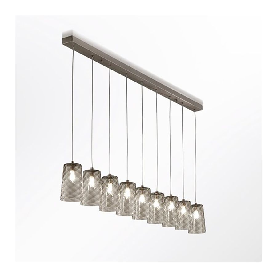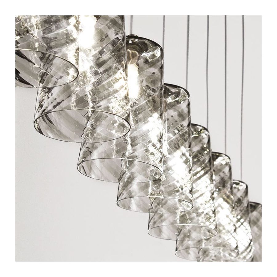 This suspension lamp is entirely formed by a repeated module; the structure is sober and yet refined. In Candy the protagonist is not the lighting work, but the light itself, that glares in every direction thanks to the peculiar spiral texture of the blown glass.