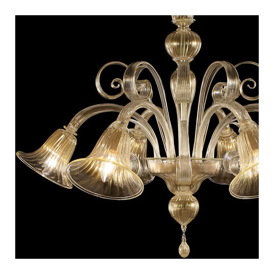 The blown glass chandeliers collection Capriccio 560 has the position of the lights, which are downwards. It is the best solution when the ceiling is not very high, without renouncing to the elegance and the magnificence of a venetian chandelier. As in many other collections by Multiforme, not only the structure but also the colours are innovative.